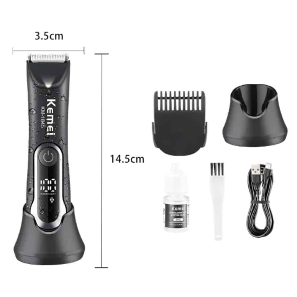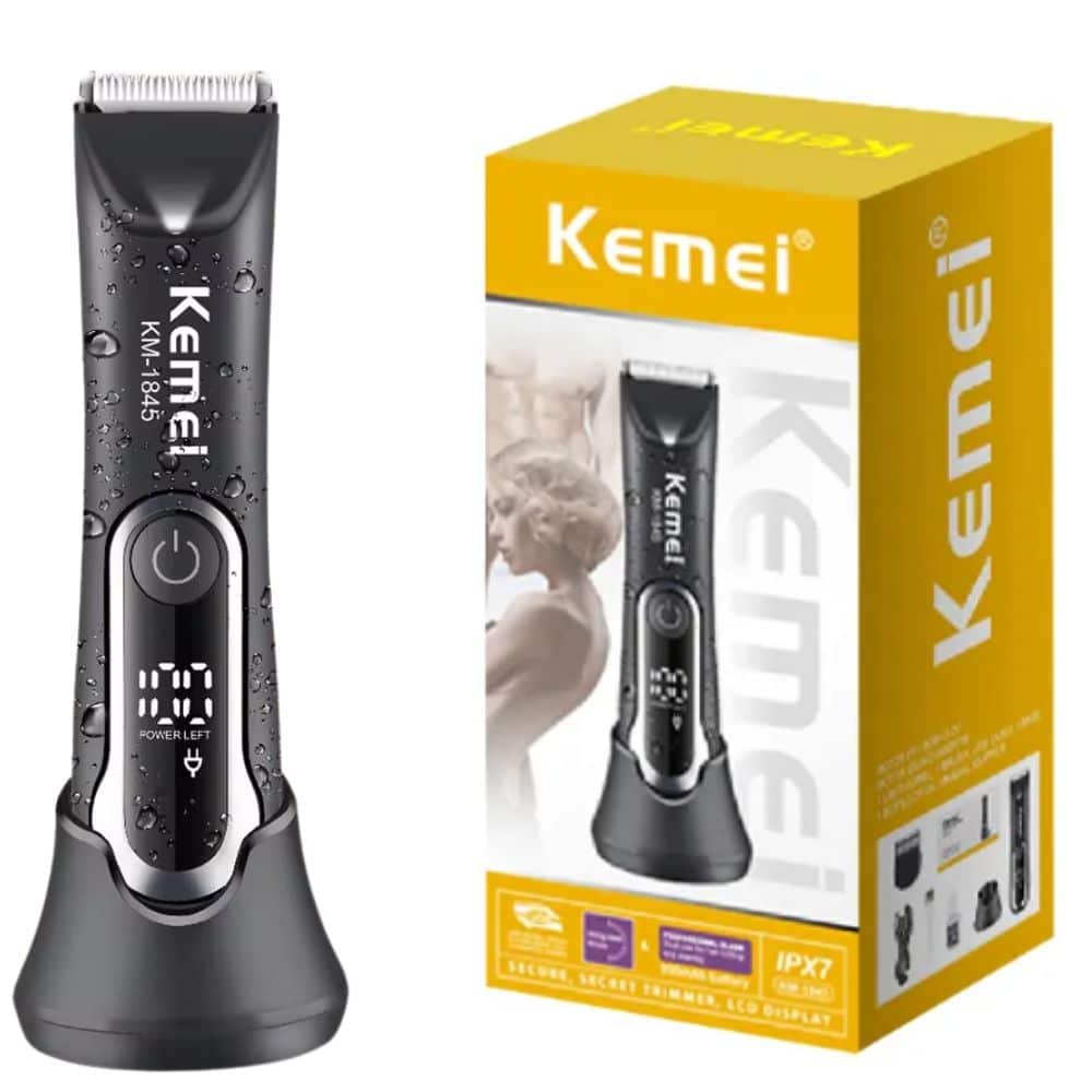 La afeitadora rasuradora hombre partes íntimas resistente al agua Kemei km-1845 está diseñada para ofrecer una experiencia de afeitado cómoda y segura en áreas sensibles.