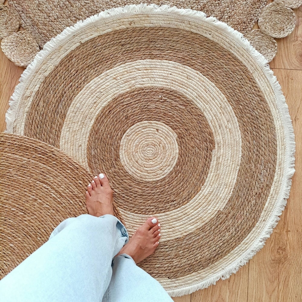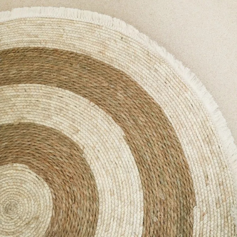 Disponible en tres tamaños (80cm, 100cm y 120cm de diámetro seleccionar al momento de la compra), esta alfombra se adapta fácilmente a cualquier espacio, desde salas de estar hasta dormitorios. Fabricada con materiales sostenibles como el seagrass natural y el yute, destaca por su durabilidad y resistencia, además de ser un complemento elegante.