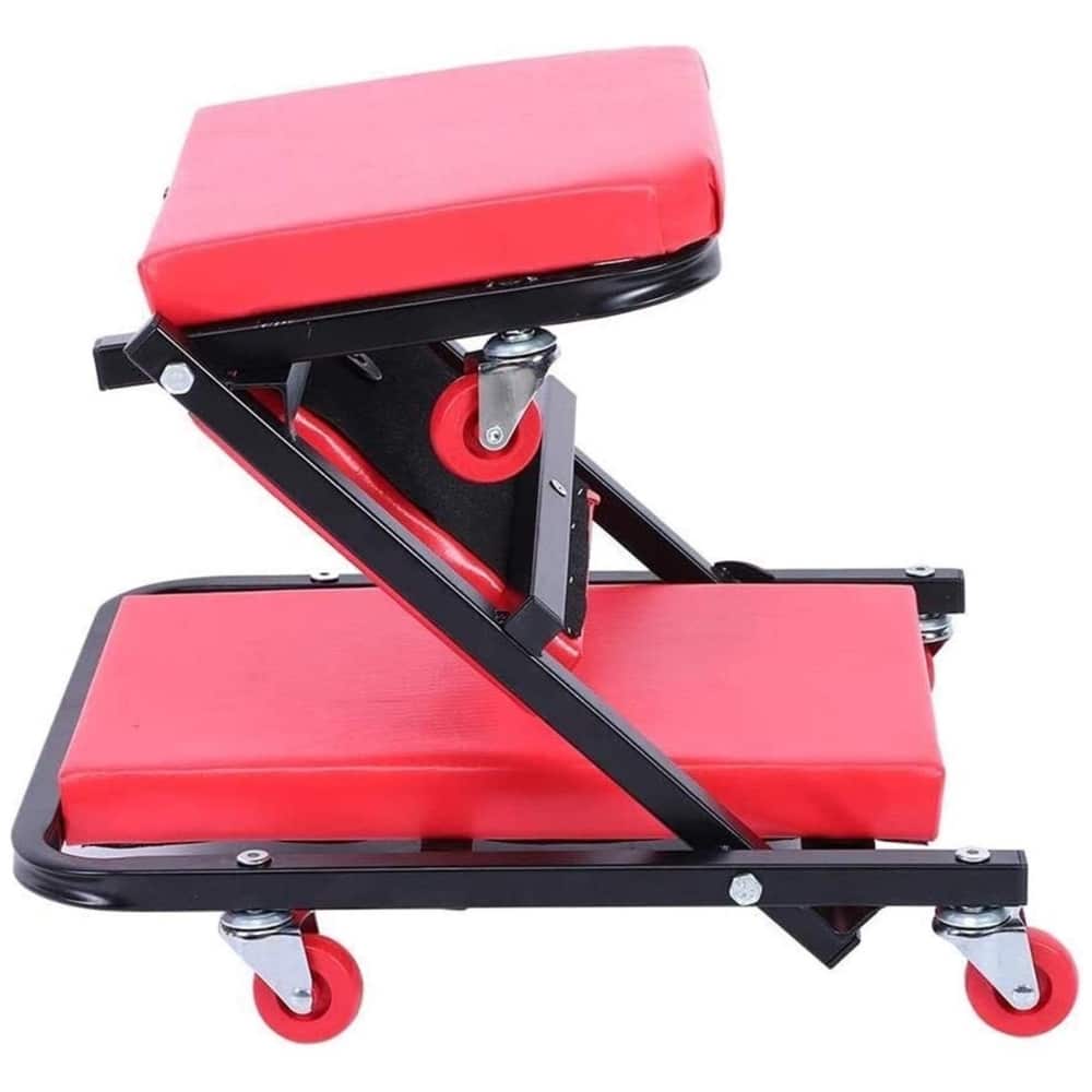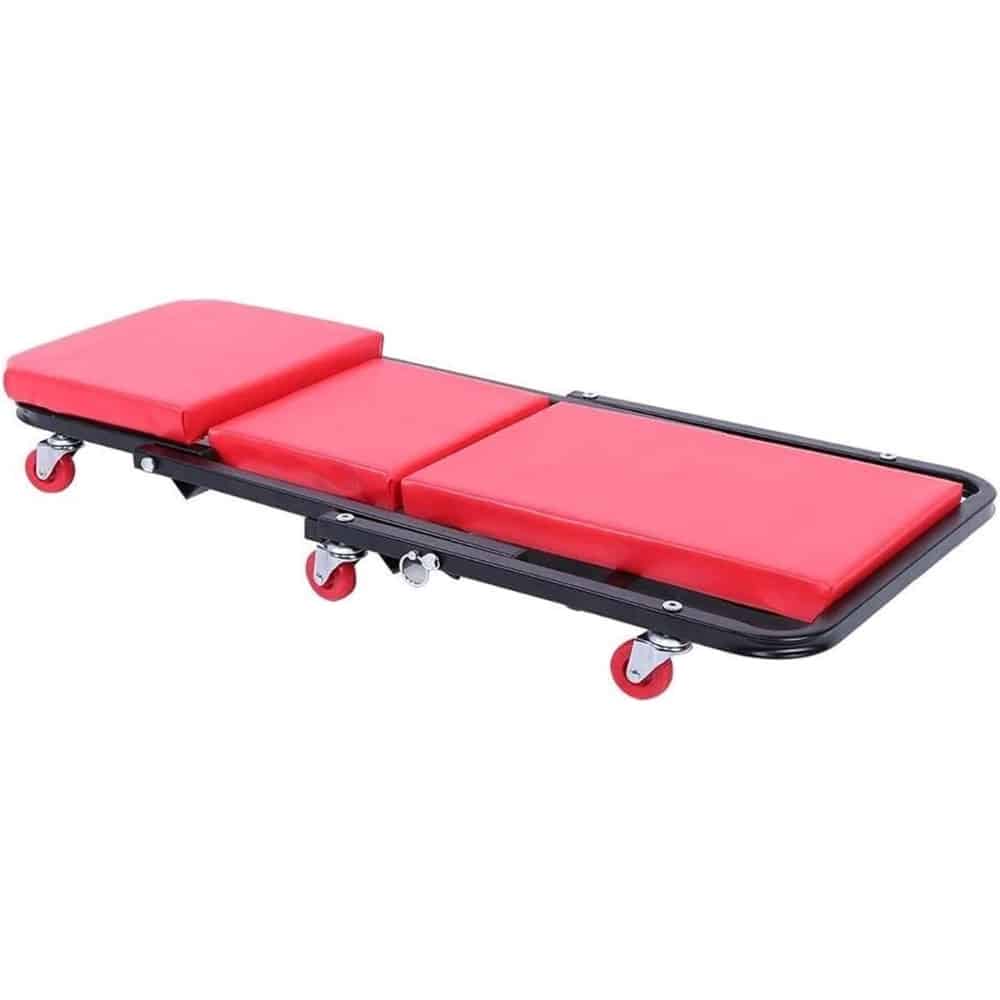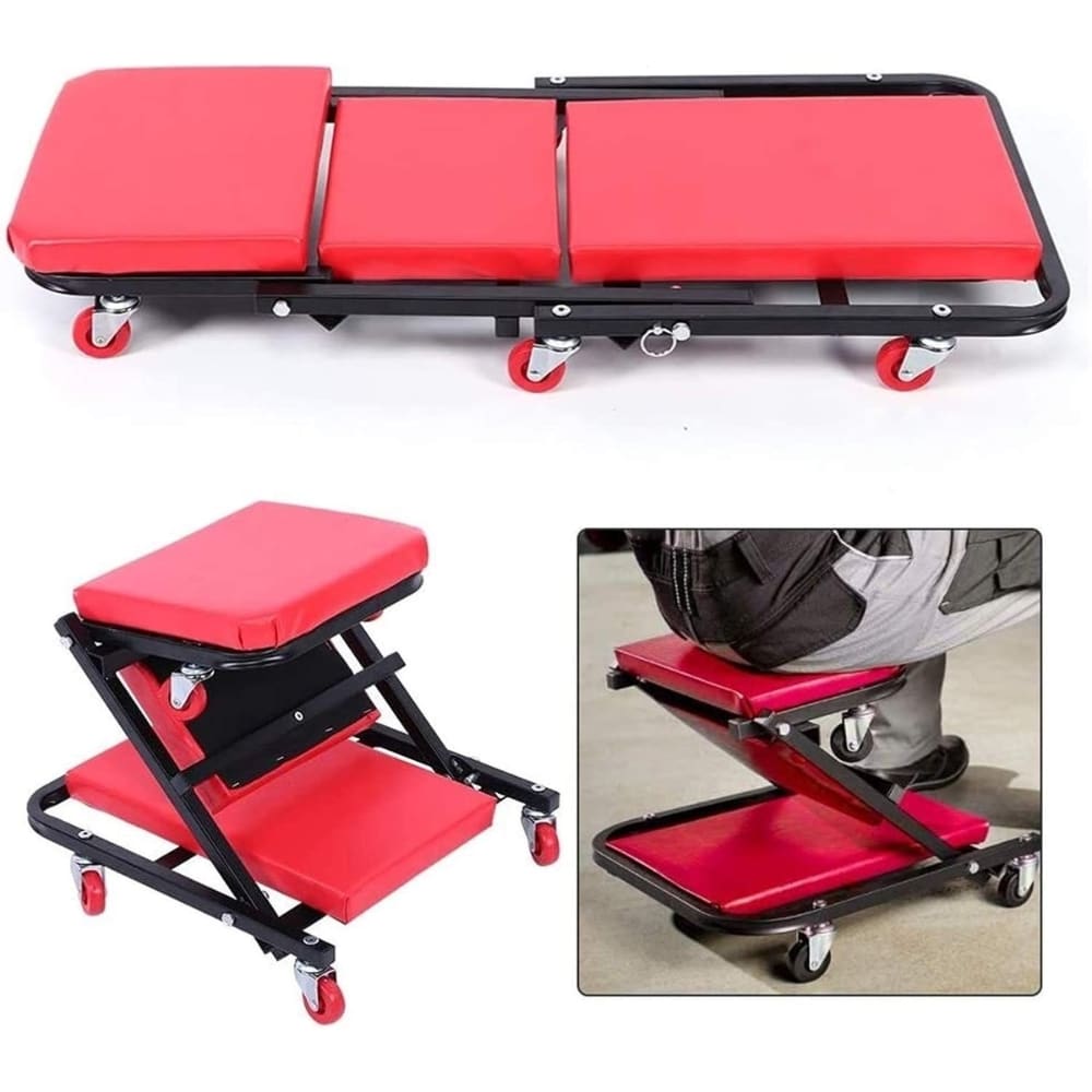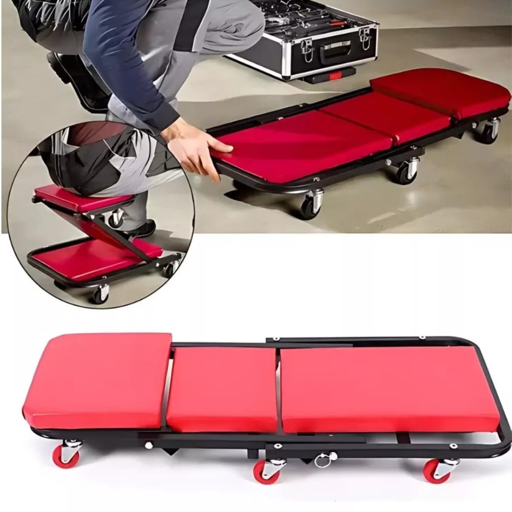 - Diseño Multifuncional: Su sistema plegable en forma de Z lo convierte en una camilla para trabajar cómodamente debajo del vehículo, o en un banco para trabajos que requieran estar a mayor altura.