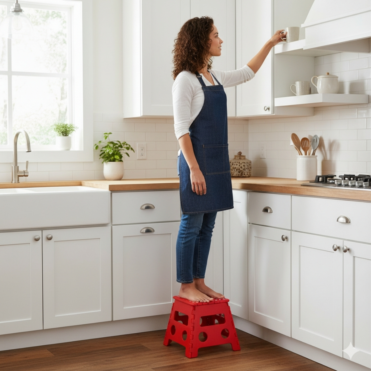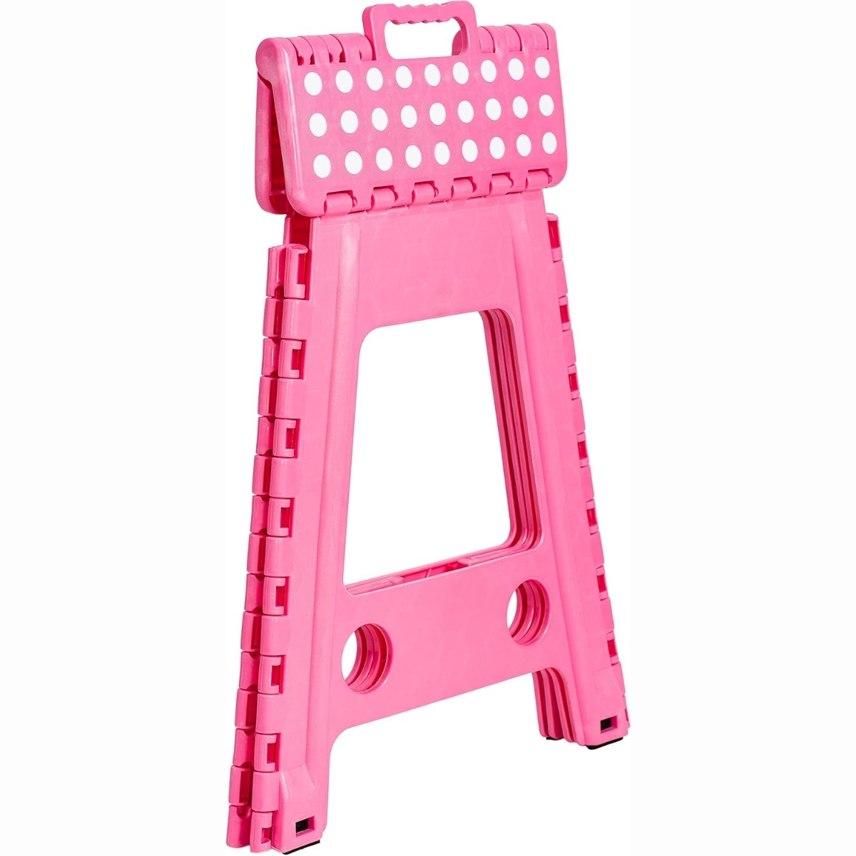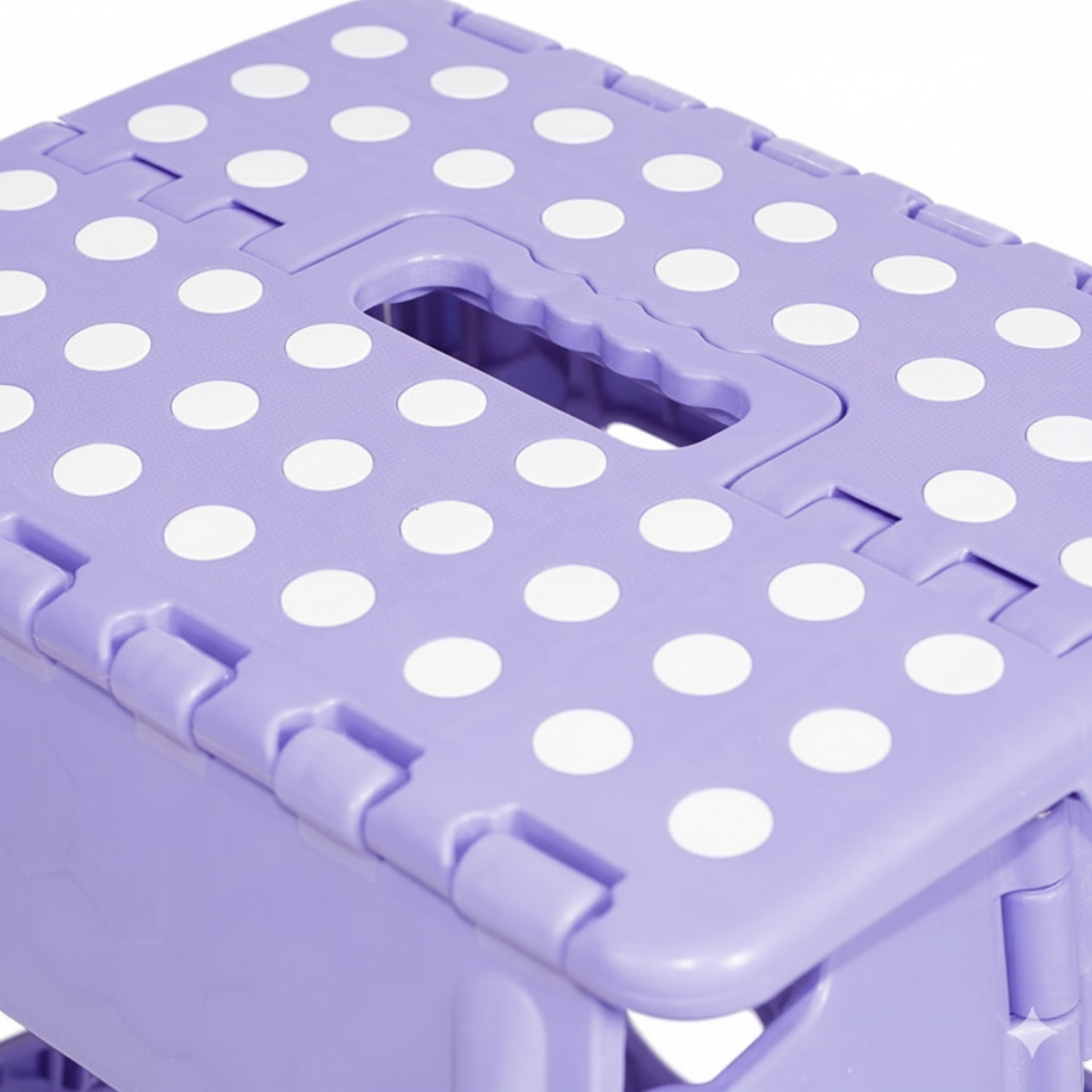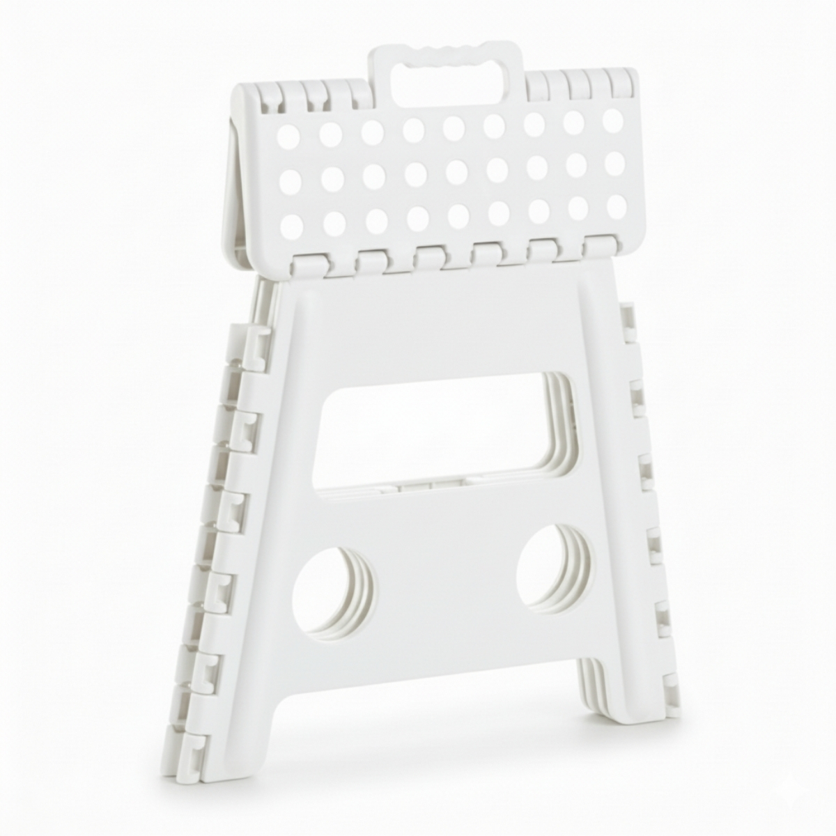 Además, su superficie superior cuenta con puntos antideslizantes que brindan seguridad al subir o alcanzar lugares altos. El sistema de pliegue rápido con bisagras reforzadas permite guardarlo fácilmente en cualquier rincón o transportarlo sin esfuerzo, ya que incorpora una práctica manija que facilita el traslado.