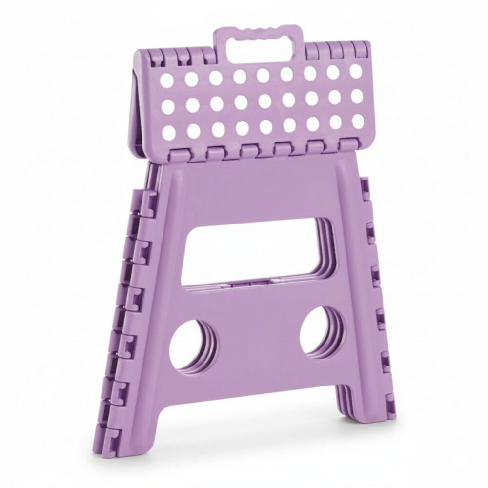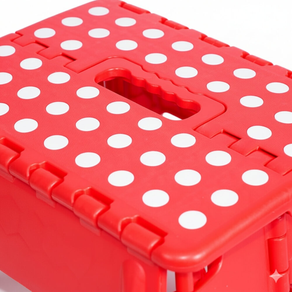 Además, su superficie superior cuenta con puntos antideslizantes que brindan seguridad al subir o alcanzar lugares altos. El sistema de pliegue rápido con bisagras reforzadas permite guardarlo fácilmente en cualquier rincón o transportarlo sin esfuerzo, ya que incorpora una práctica manija que facilita el traslado.