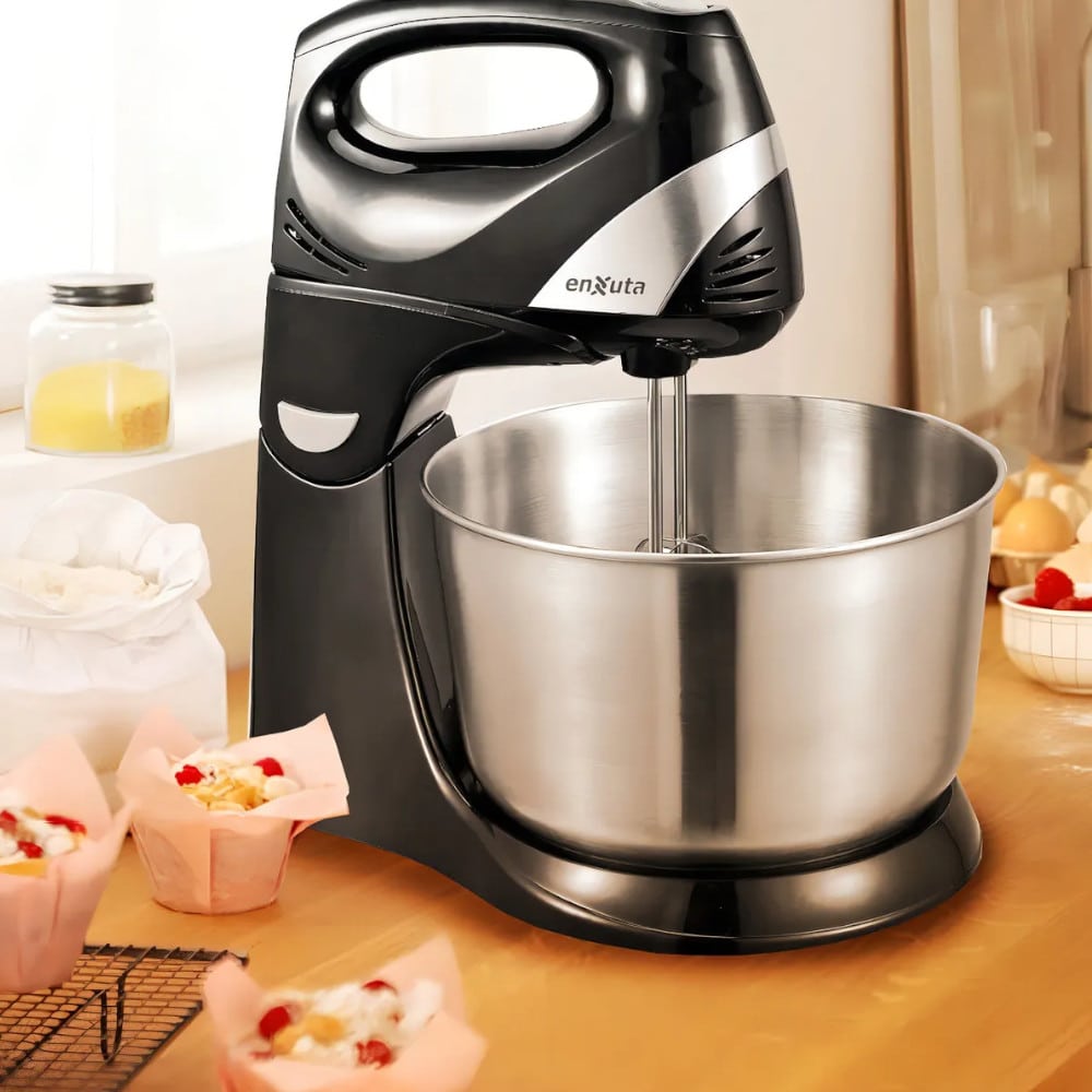 La batidora Enxuta viene equipada con un bowl de acero inoxidable de 4,3 litros, resistente, higiénico y fácil de limpiar, ideal para preparar grandes cantidades sin complicaciones. Además, incluye accesorios especiales para batir y amasar, que te permitirán desde montar claras hasta preparar panes, tortas, galletas y mucho más.