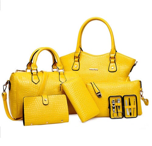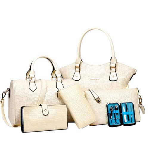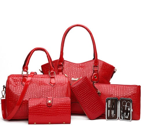 El Kit de Carteras mas completo que podes tener, todo haciendo juego en un material único. 6 piezas que incluyen 1 bolso,1 cartera,1 sobre,1 monedero,1 billetera y un neceser con accesorios de belleza.