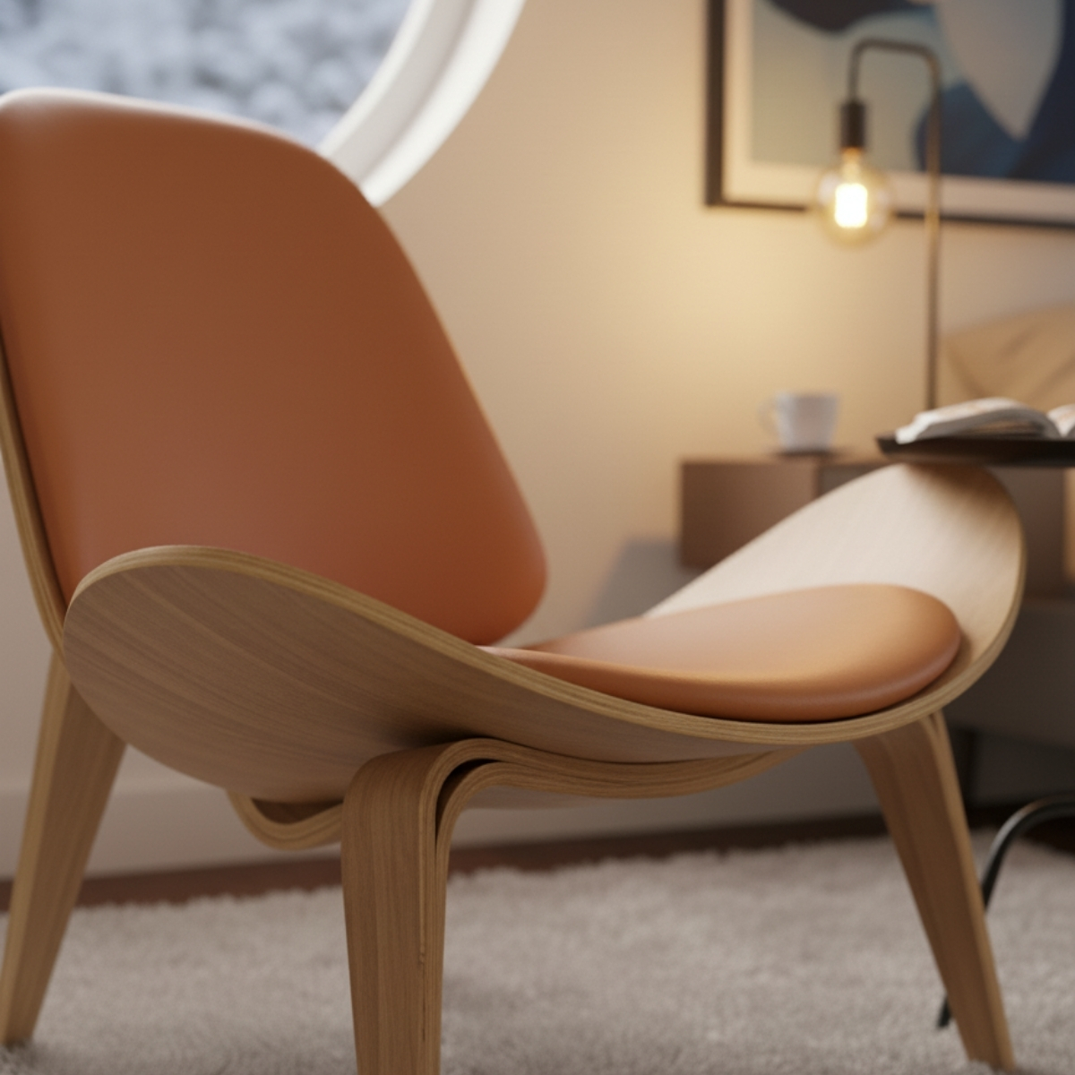 Butaca Shell Moderna de Madera Maciza con Cuero Sintetico Silla Estilo Eames Diseño Elegante y Cómodo Sillon Estilo Moderno Nordico