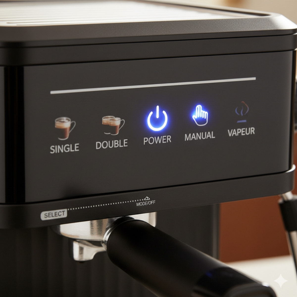 La máquina cuenta con funciones seleccionables para café simple, doble o modo manual, junto con indicadores luminosos que facilitan su uso diario. Su bandeja recoge gotas de acero inoxidable es extraíble, lo que simplifica la limpieza y el mantenimiento.