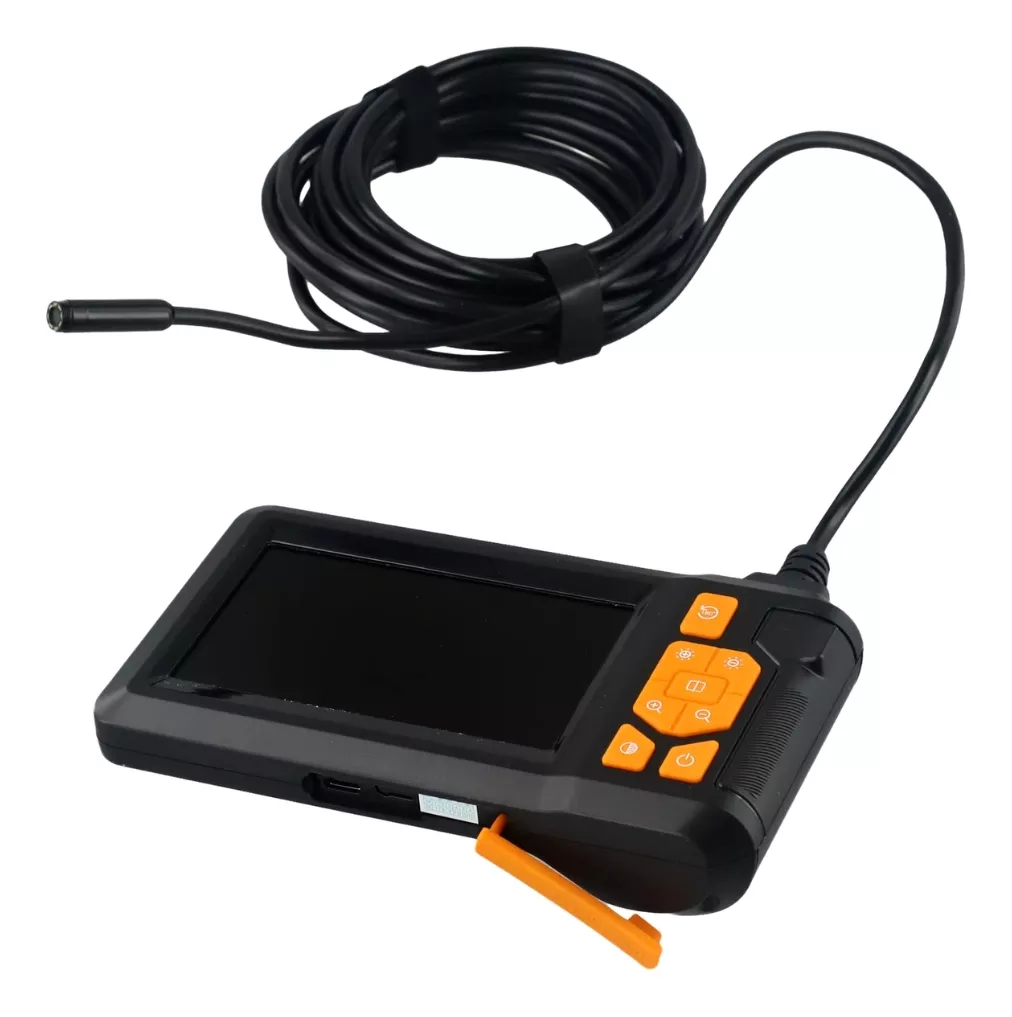 Cámara de inspección endoscópica de 2 metros con pantalla HD de 4.3″, resistente al agua IP67 y luz LED integrada. Ideal para inspecciones en espacios difíciles de alcanzar.