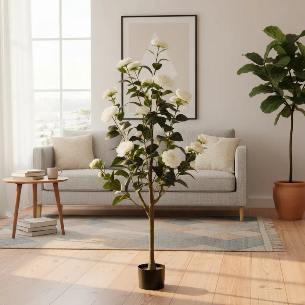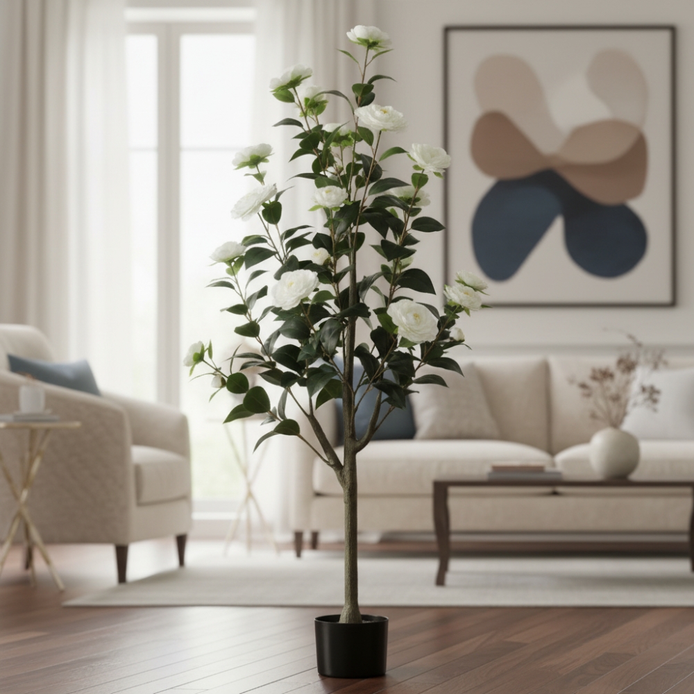 Gracias a su altura de 120 cm, esta camelia artificial se destaca como pieza decorativa principal en livings, oficinas, locales comerciales, recepciones o espacios interiores amplios. Es ideal para quienes desean una solución práctica y elegante, sin riego, sin luz especial y sin cuidados constantes.
