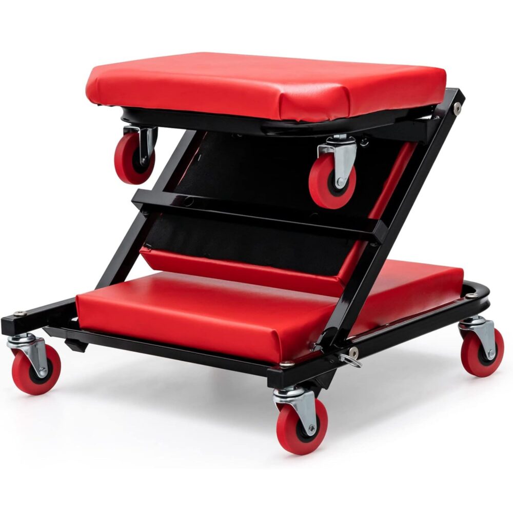 Cuenta con seis ruedas giratorias de 360°, lo que facilita el movimiento en cualquier dirección, ideal para maniobrar en talleres o garajes. Su acolchado grueso proporciona soporte cómodo, reduciendo la fatiga durante tareas prolongadas.