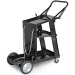 La bandeja superior de 45 × 28 cm ofrece un espacio adecuado para soldadoras compactas, mientras que las bandejas intermedias permiten almacenar máscaras, electrodos, cables, pinzas o herramientas adicionales. La plataforma inferior, a tan solo 12,5 cm del suelo, es ideal para colocar equipos más pesados o incluso botellones de gas, los cuales pueden asegurarse con las cadenas incluidas para mayor seguridad.