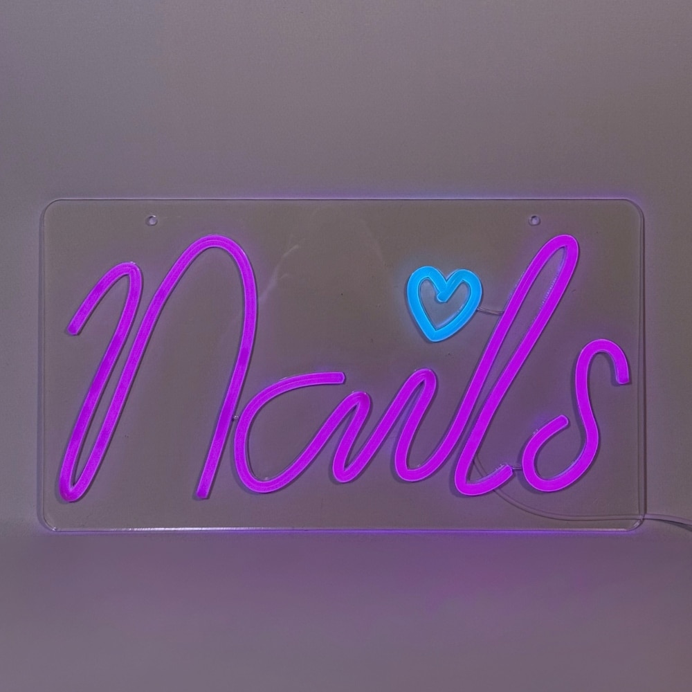 Transformá tu espacio con este Cartel de NEON Colgante 40cm, ideal para salones de belleza, estudios de uñas o como decoración llamativa en cualquier rincón moderno. Este cartel LED tiene la palabra "NAILS" en un elegante color rosa con un corazón azul brillante, todo montado sobre un acrílico rectangular de alta calidad.