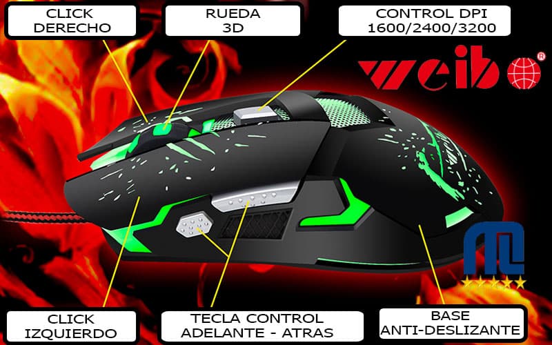 El Mouse Weibo S10 tiene un formato ergonómico adaptándose fácilmente a la mano del usuario. Cuenta con 6 botones de alta precisión al igual que el control total del nivel de DPI