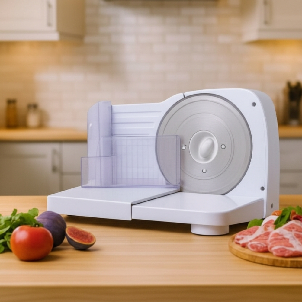 Su ajuste de grosor permite seleccionar desde rebanadas delgadas hasta cortes más gruesos, adaptándose a cada receta o necesidad de presentación. El modelo es compacto y plegable, lo que facilita su almacenamiento cuando no está en uso.