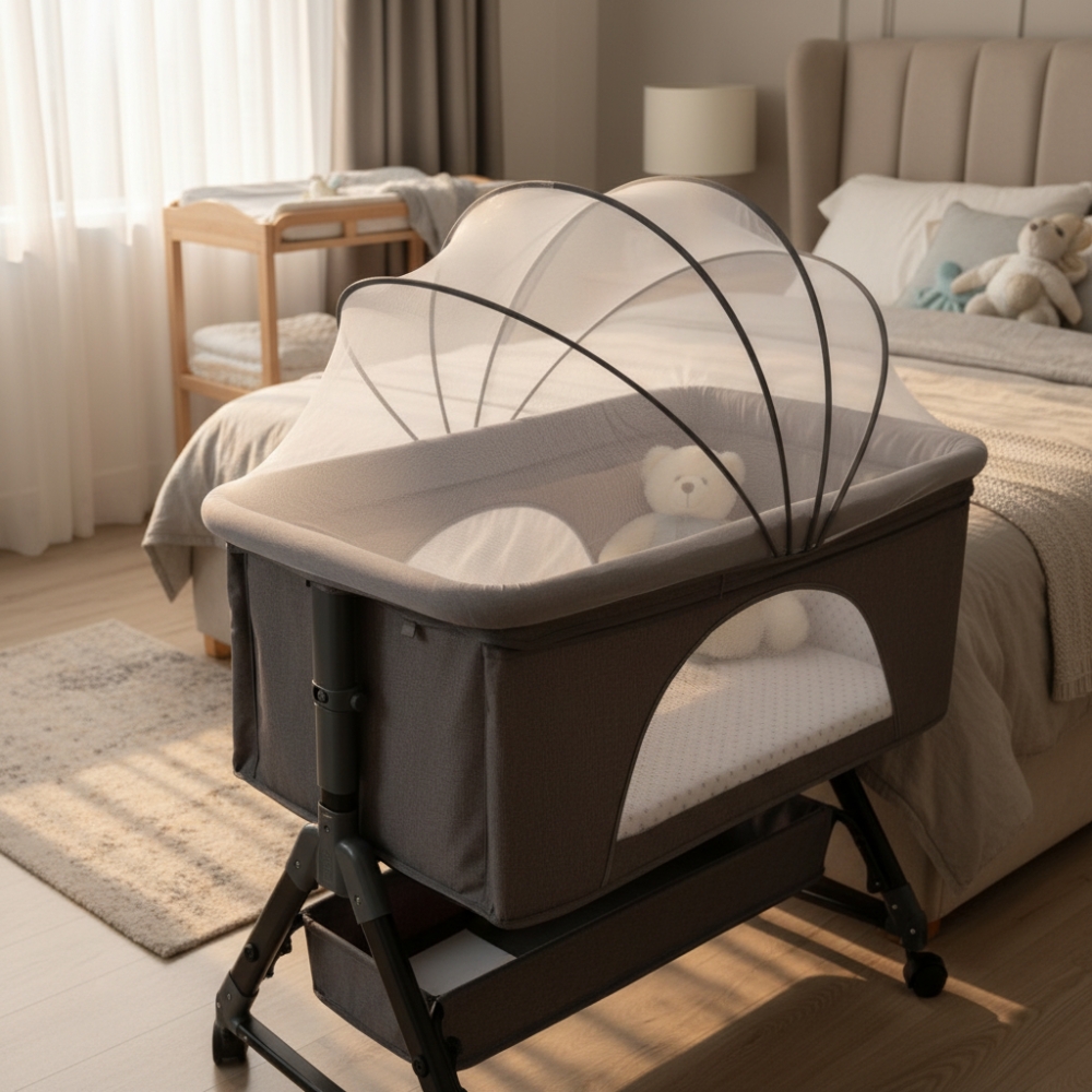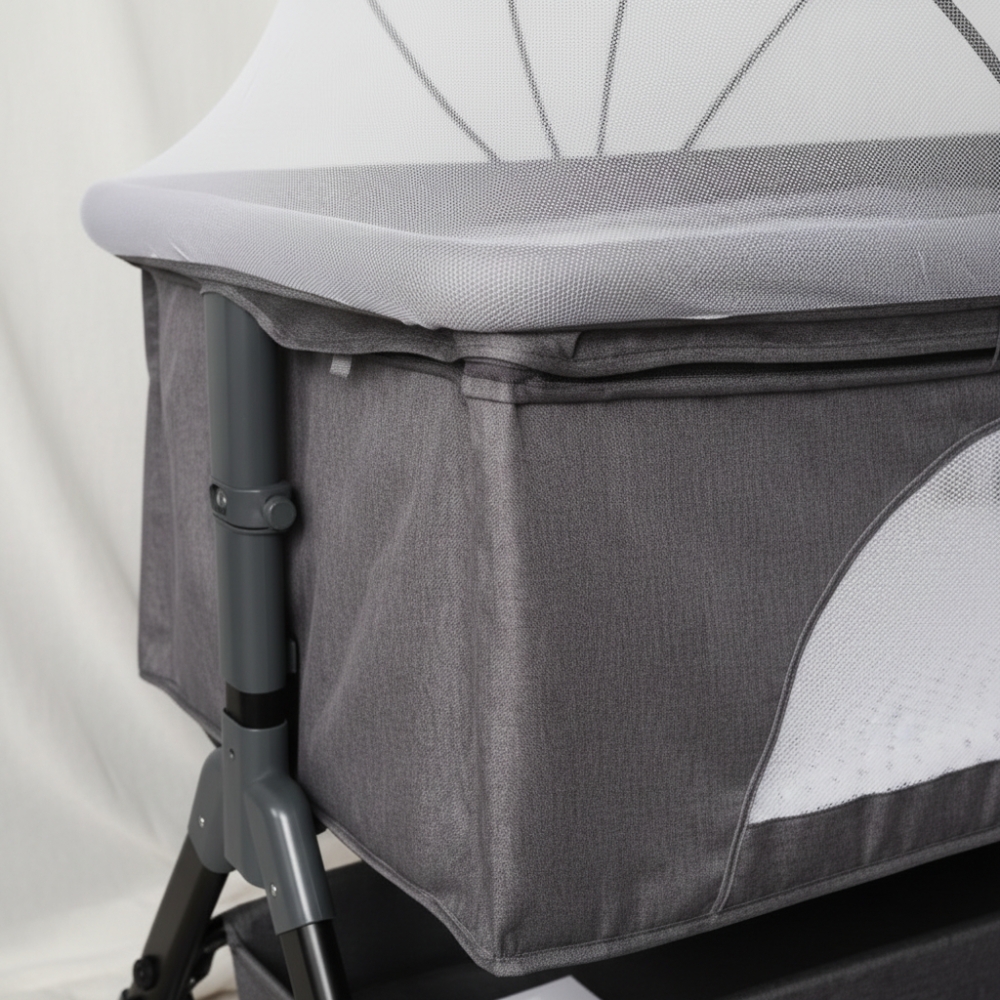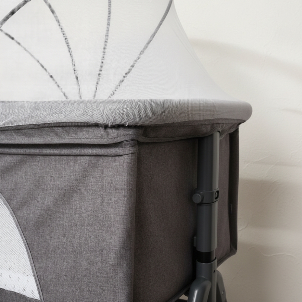 Uno de sus costados es abatible, permitiendo unir la cuna a la cama de los padres para un colecho seguro, favoreciendo el contacto cercano y la comodidad durante la noche. En la parte superior, cuenta con un mosquitero incluido, que protege al bebé de insectos mientras permite una correcta circulación del aire. A su vez, los laterales cuentan con aberturas de malla, lo que mejora la ventilación y permite ver al bebé en todo momento.