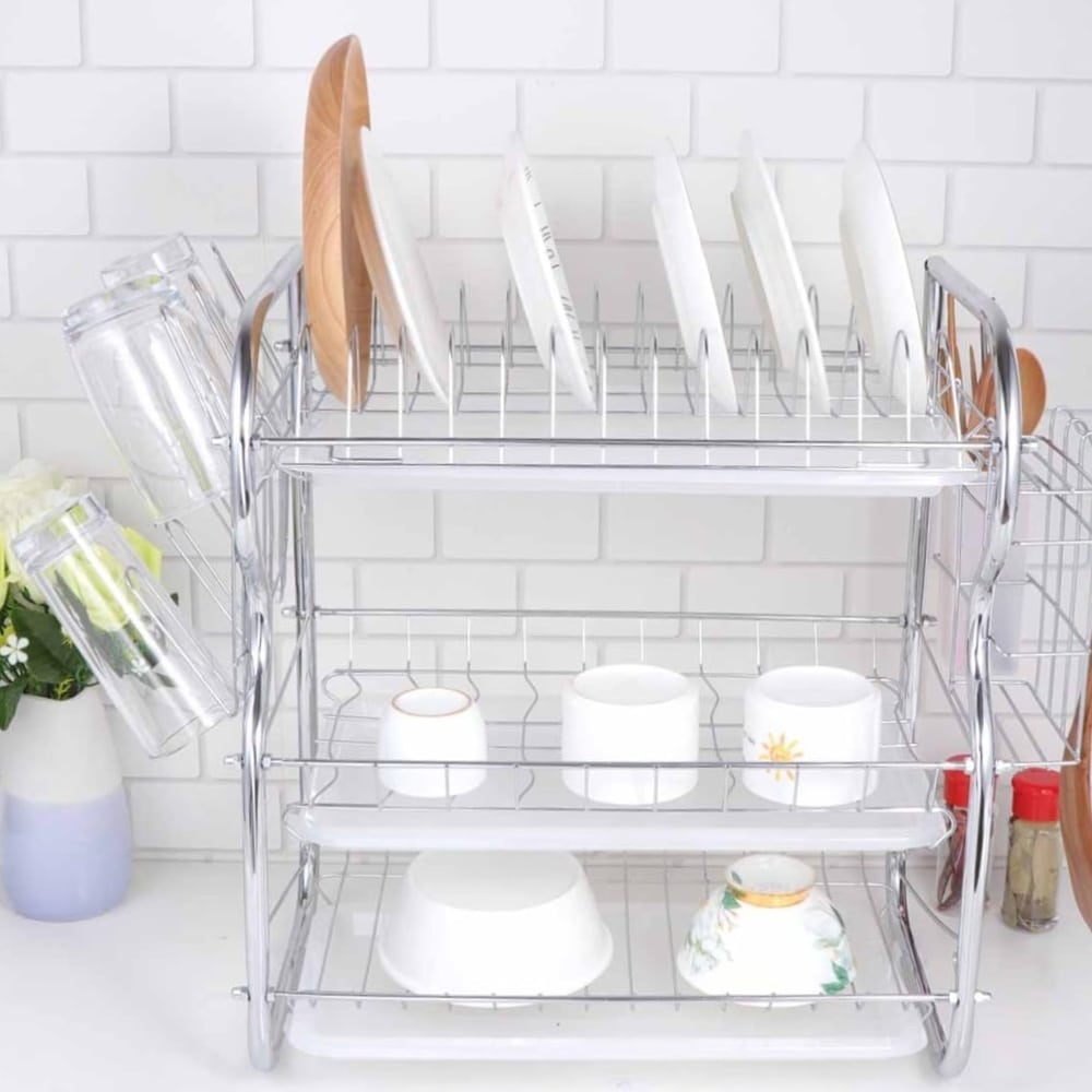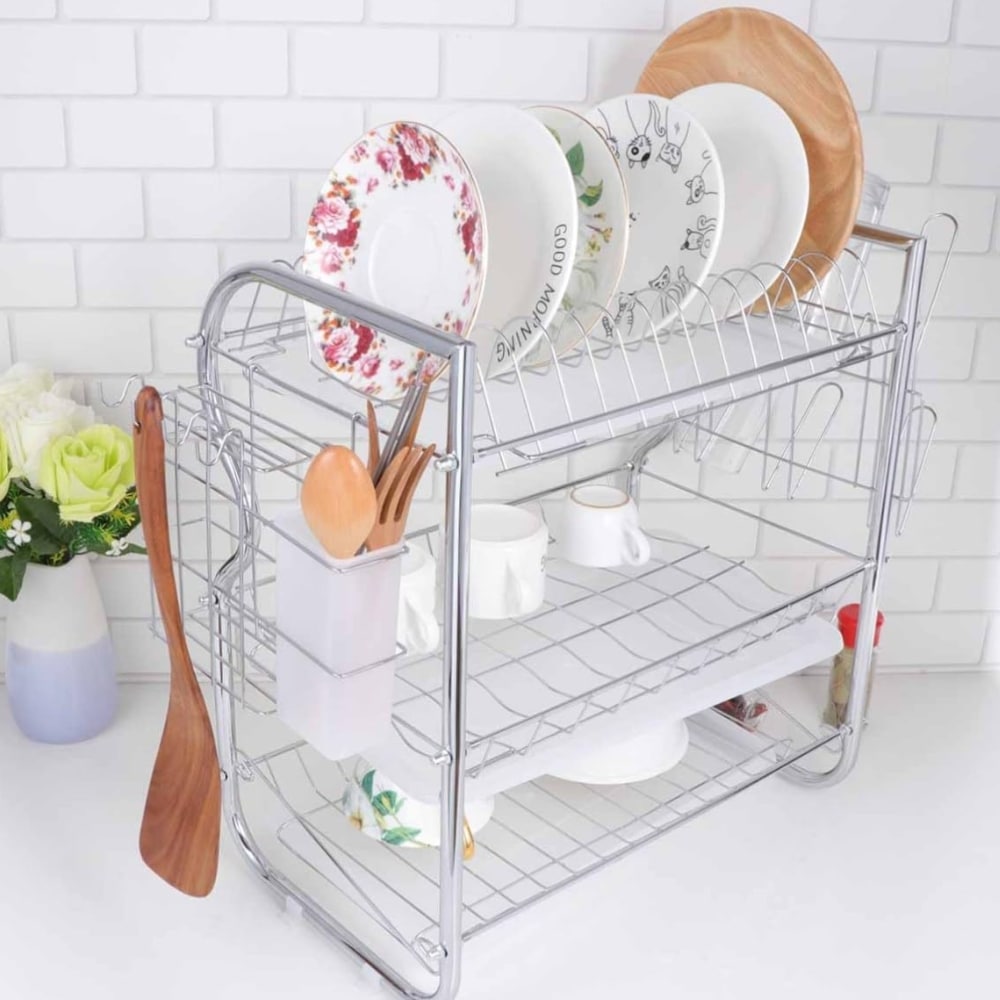 Descubre la funcionalidad y el diseño elegante de nuestro escurridor de tres pisos en acero inoxidable. Este accesorio de cocina es perfecto para quienes buscan maximizar el espacio y mantener sus utensilios de cocina organizados.