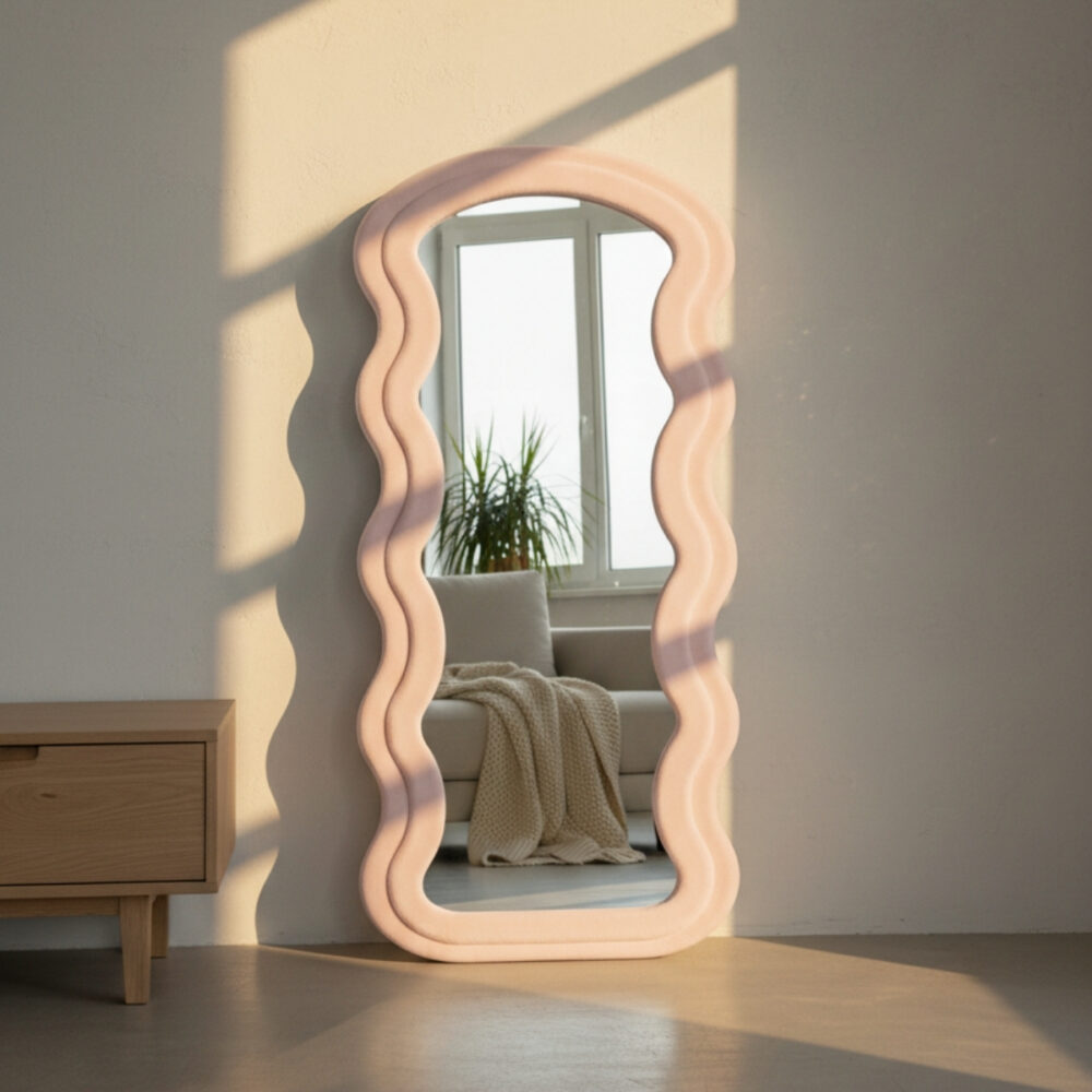 El Espejo Irregular Con Ondas de Pie Terciopelado es una pieza moderna y elegante que aporta estilo y amplitud a cualquier ambiente. Su diseño con bordes curvos y suaves rompe con lo tradicional, creando un efecto visual atractivo que se adapta fácilmente a espacios modernos, nórdicos o minimalistas.