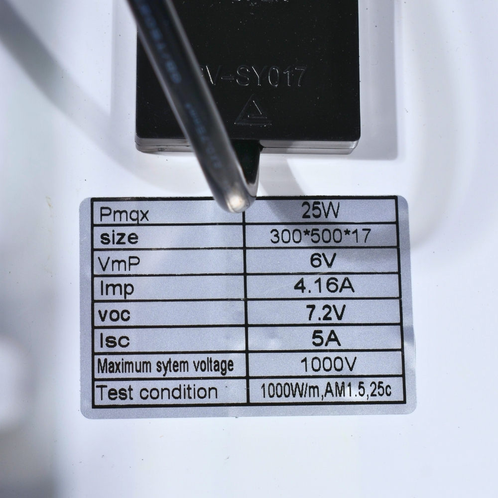 El panel solar independiente tiene especificaciones técnicas que aseguran su alto rendimiento: potencia máxima de 25W, tamaño de 300 x 500 x 17 mm, voltaje máximo del sistema de 1000V, y condiciones de prueba bajo irradiancia de 1000 W/m² a 25 °C. Estas características garantizan una carga eficiente de la batería integrada, manteniendo el foco listo para funcionar cada noche.