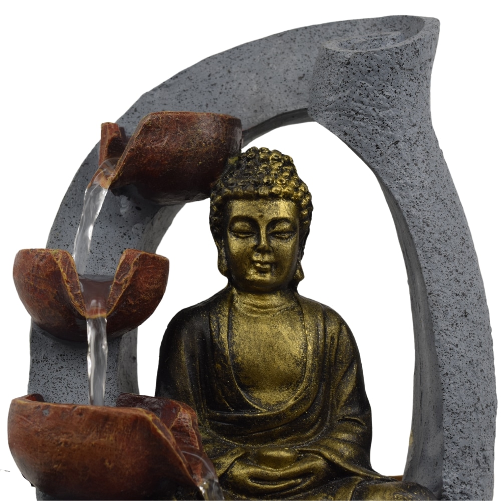 Con un diseño de 3 pisos de agua cascada, crea un ambiente relajante con el sonido suave del agua fluyendo. Además, el Buda dorado añade un toque de elegancia y espiritualidad.