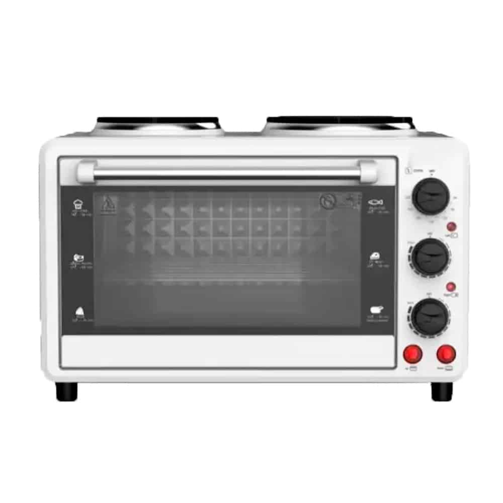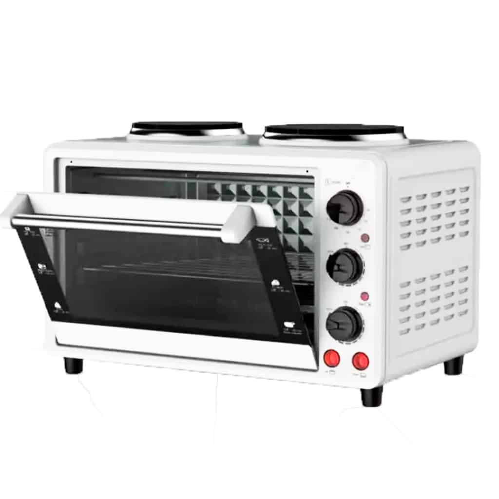 El horno eléctrico SU TAI es un horno eléctrico con un elegante y moderno diseño en color negro. Cuenta a su vez, con una puerta con un amplio visor para controlar el estado de la comida , sistema de apertura vertical y comandos de control accesibles. Además, dispone de dos hornallas superiores. Mientras que su capacidad es de 38 litros.
