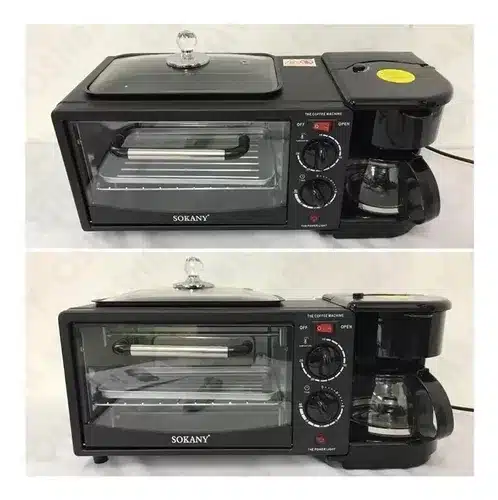 Este horno eléctrico 3 en 1 de Sokany es la solución perfecta para quienes buscan practicidad y ahorro de espacio en la cocina. Con una capacidad de 9 litros, este electrodoméstico combina horno, cafetera y plancha en un solo aparato, permitiendo preparar un desayuno completo sin ocupar demasiado espacio.