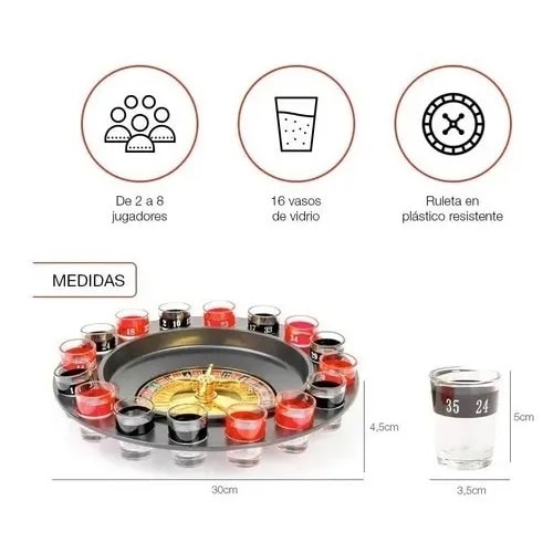 - Incluye una bola de ruleta con otra de repuesto, 16 vasos de chupito, instrucciones de uso