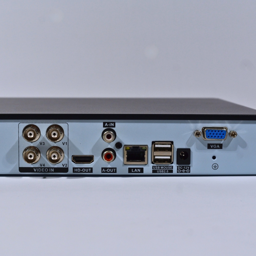En cuanto a conectividad, el DVR cuenta con 4 entradas de video, 1 salida HD, 1 entrada y 1 salida de audio, 1 puerto LAN, 2 puertos USB 2.0, 1 puerto VGA y alimentación DC 12V, ofreciendo múltiples opciones de configuración.