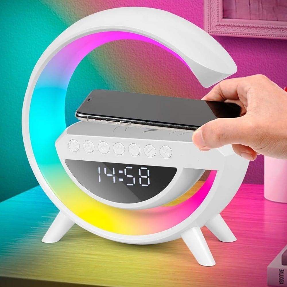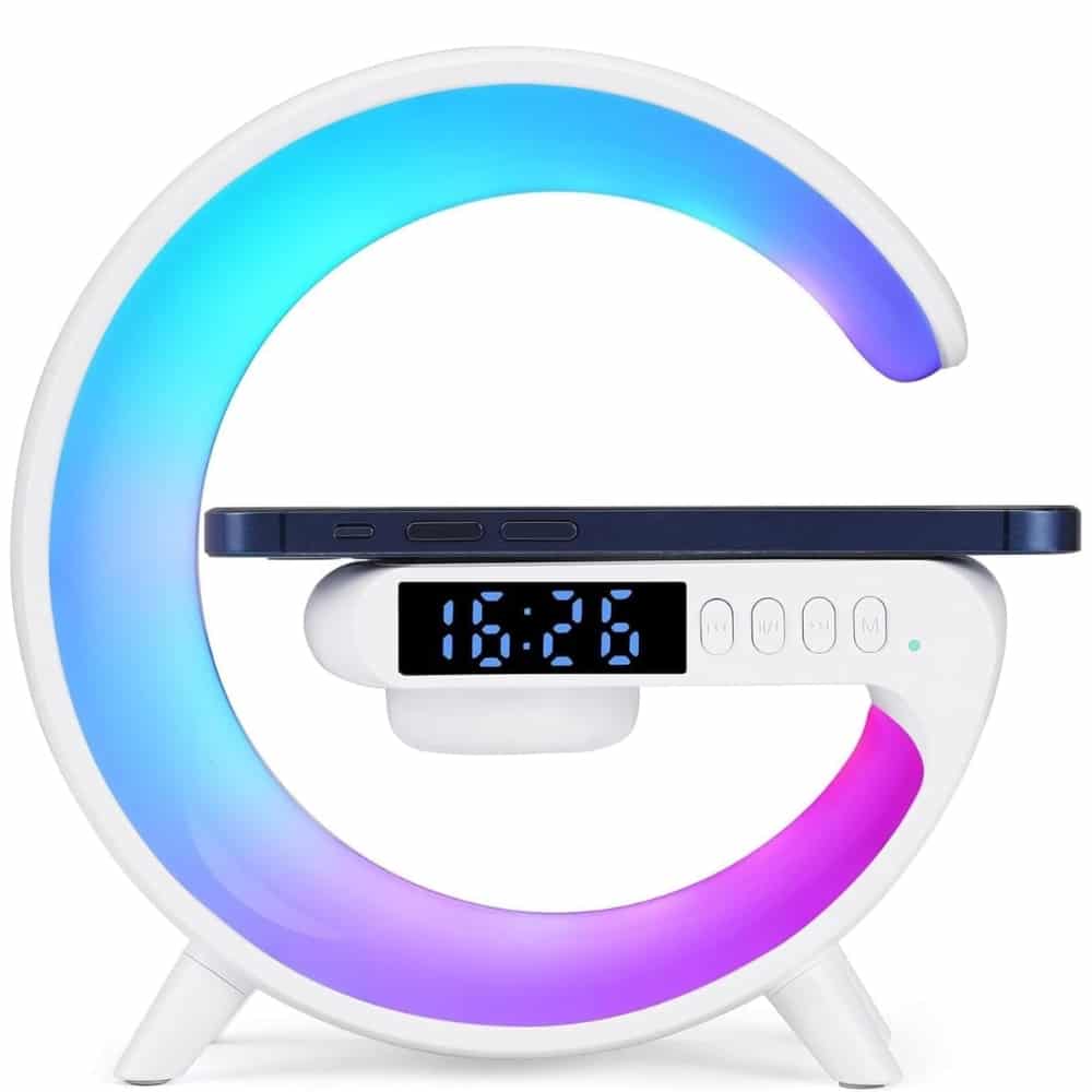 La Lámpara Reloj Bluetooth FM con Alarma y Carga QI es la compañera perfecta para tu espacio. No solo es una lámpara LED con un diseño único en forma de G, sino que también tiene un montón de funciones que te van a facilitar la vida. Con 7 tipos de luces diferentes, podés ajustarla a tu gusto o al ambiente que querés crear.