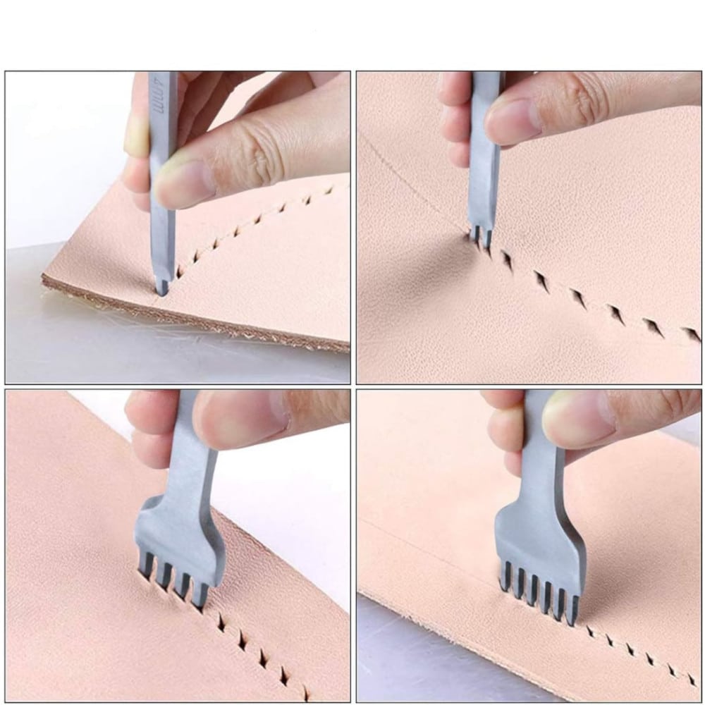 - Contiene punzones de punta para perforaciones limpias y precisas en el cuero.