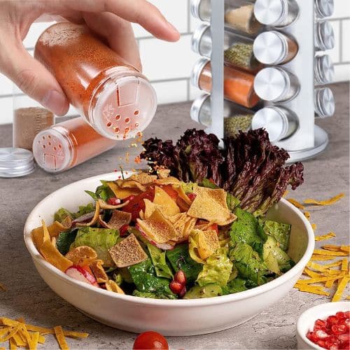 ESPECIERO para cocina que cuenta con una superficie giratoria, facilitando el acceso a todos los frascos y mejorando la experiencia de cocinar.