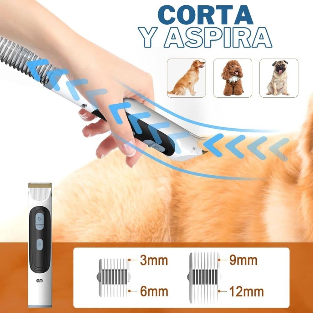 -Cabezales Intercambiables: Este versátil dispositivo incluye una cortadora de pelo con diferentes peines de diferentes longitudes, así como aspiradora común, aspiradora con cepillo, cepillos de deslanado, cardas y rastrillo. ¡Todo lo que necesitas para el cuidado completo de tu mascota en un solo kit!