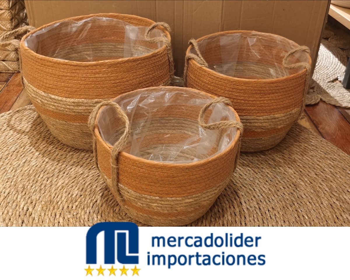 Set de 3 Cestos de Junco Natural con Manijas Elegancia y Organización en Uno