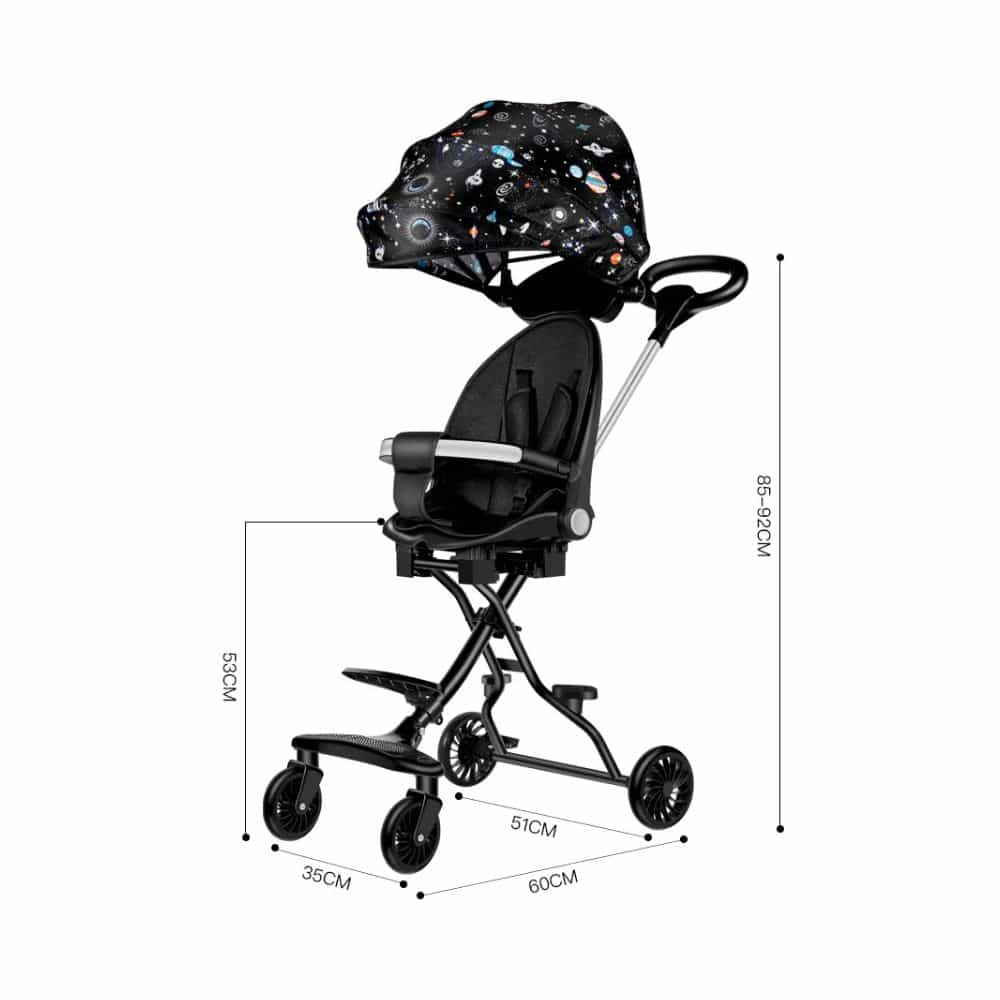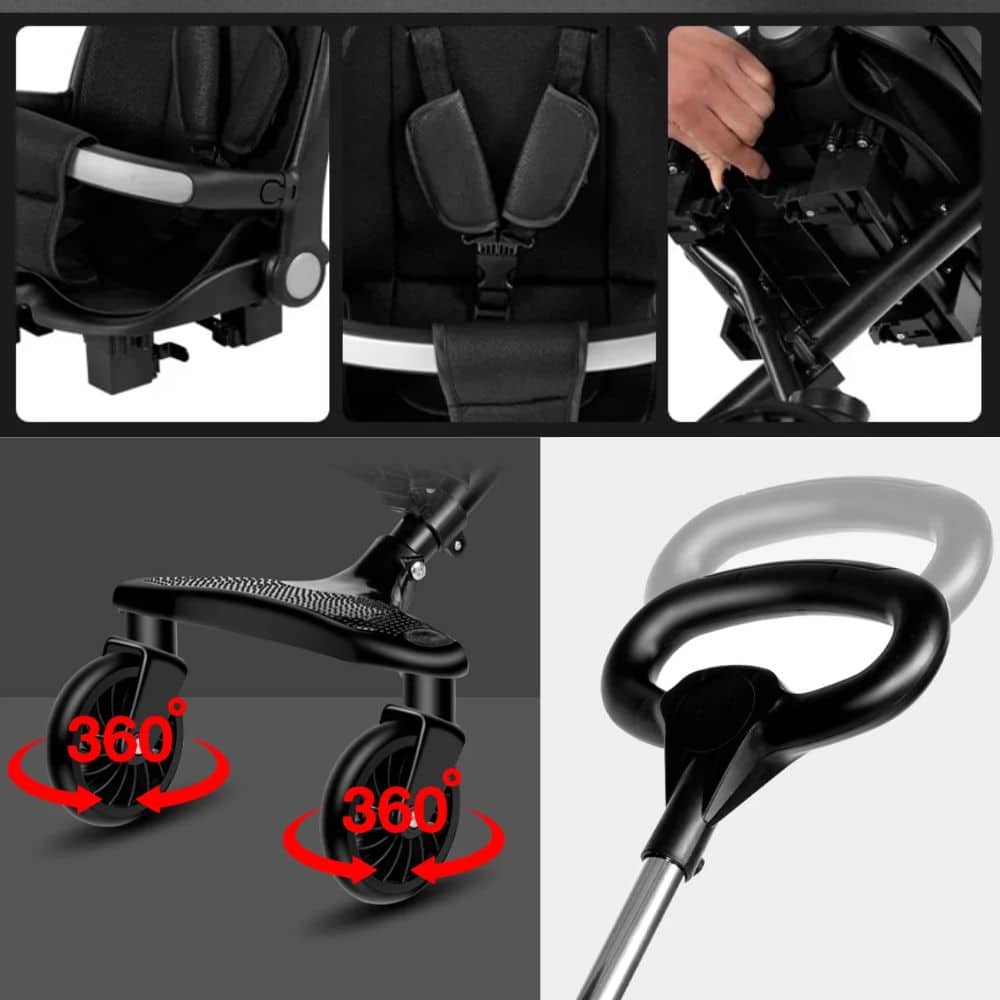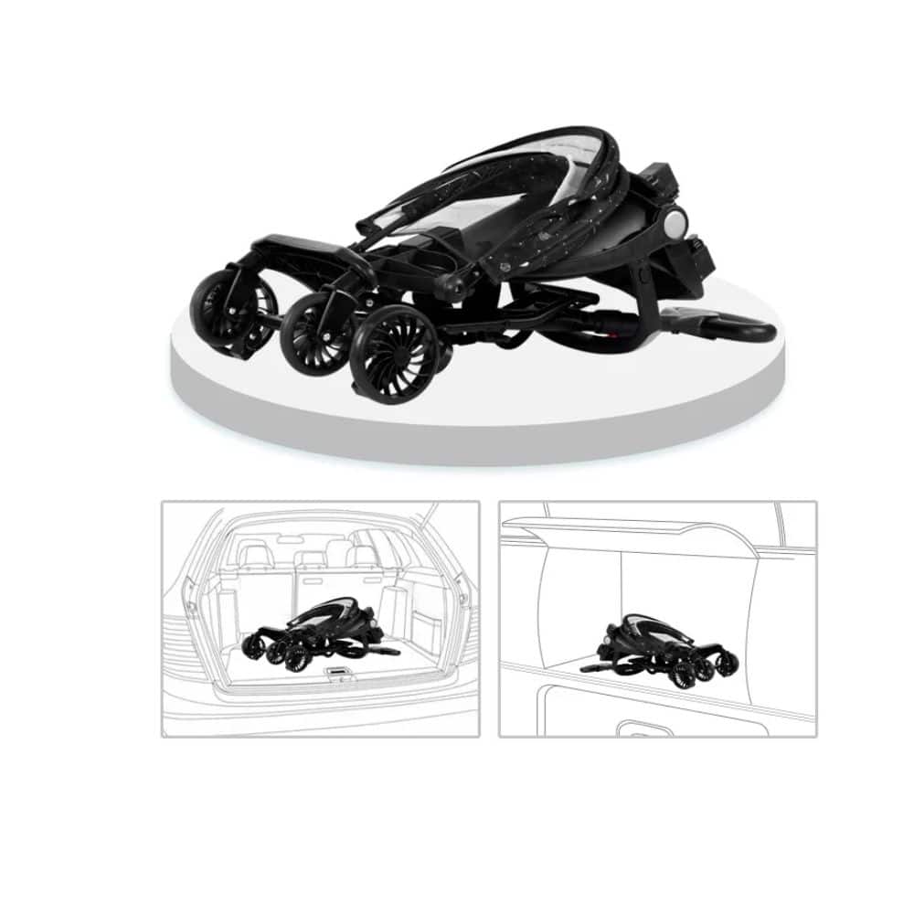 Desmontable y Ligero: Fácil de plegar y desmontar, este coche es perfecto para padres en movimiento. Se guarda con facilidad en el maletero del coche y se maneja con comodidad en el transporte público.