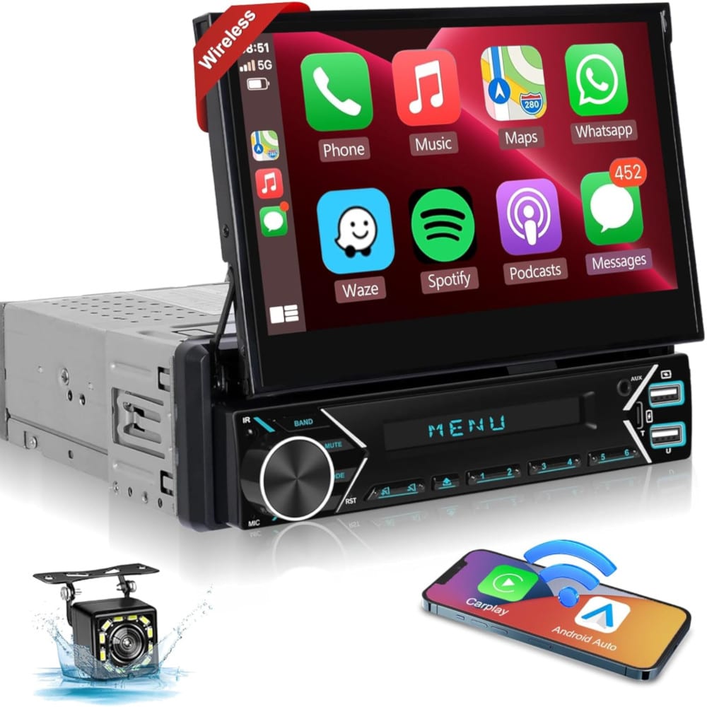 Radio para auto con pantalla táctil retráctil de 7 pulgadas, equipada con Android 12. Incluye una cámara trasera y es compatible con Carplay, ofreciendo acceso a aplicaciones, navegación GPS, música y llamadas manos libres, brindando una experiencia de entretenimiento y conectividad avanzada para tu vehículo.