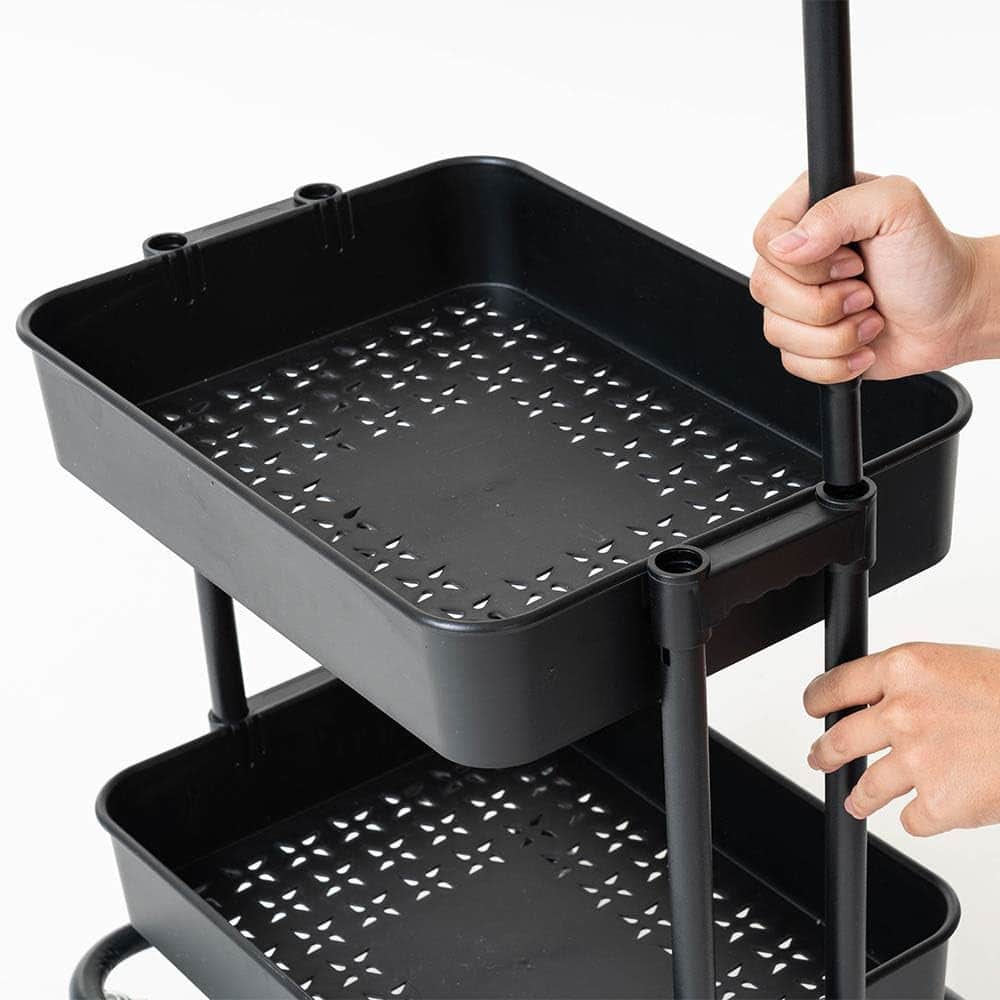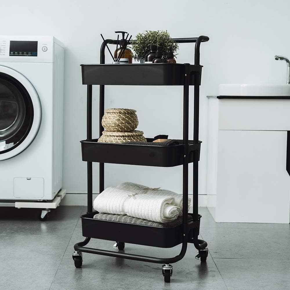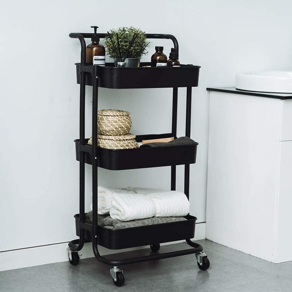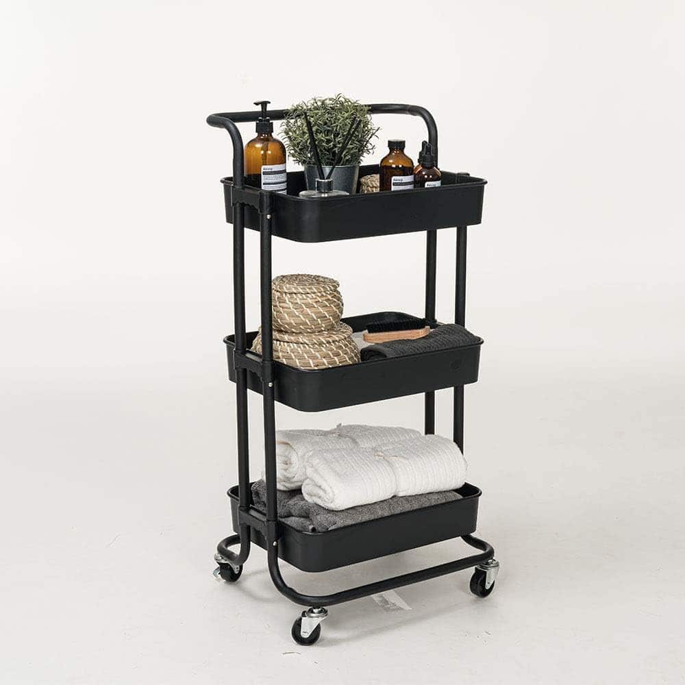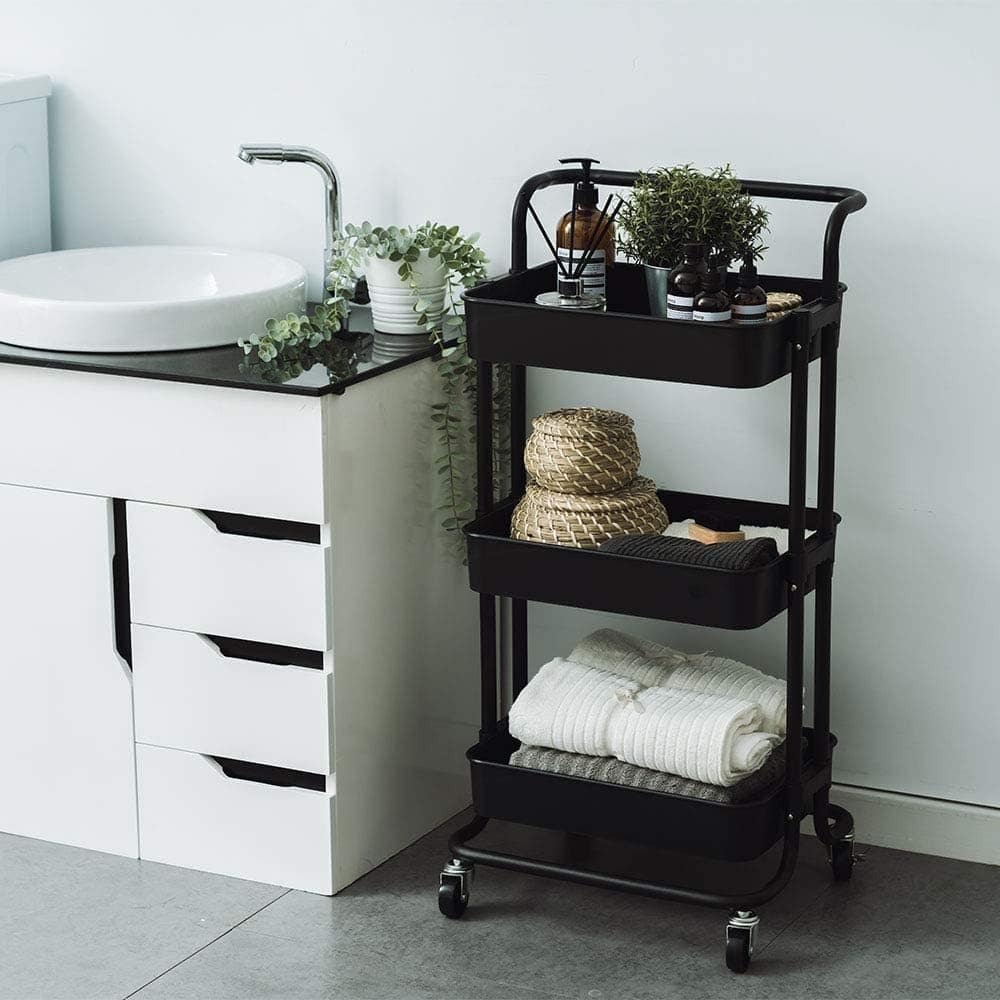 Los tres estantes proporcionan amplio espacio para organizar artículos de baño, utensilios de cocina, productos de limpieza u otros elementos esenciales. Equipado con ruedas, el carrito se desplaza fácilmente, permitiendo un transporte sin esfuerzo de un lugar a otro. Esto lo convierte en una opción conveniente para optimizar el espacio y mantener tus áreas de trabajo ordenadas.
