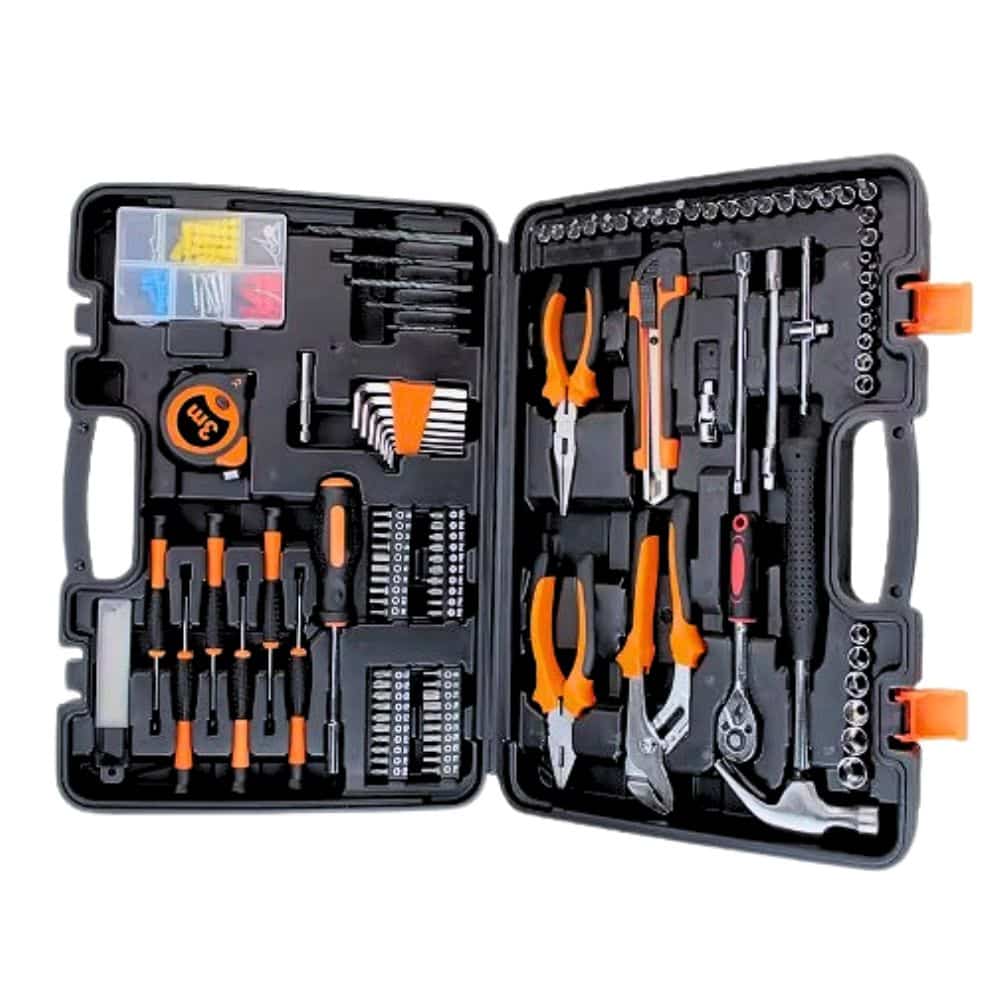 El set incluye una variedad de herramientas esenciales, como alicates, destornilladores, llaves hexagonales, llaves de vaso, un martillo, un cutter y más, todo organizado en un estuche compacto y resistente.