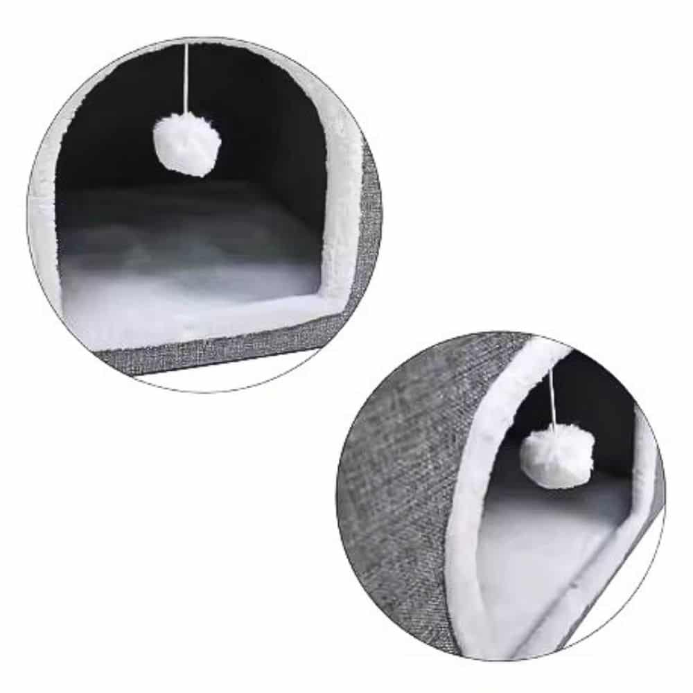 Bola de felpa colgante: Incluye una divertida bola de felpa suspendida en la entrada, estimulando el instinto de juego y manteniendo a tu gato entretenido.