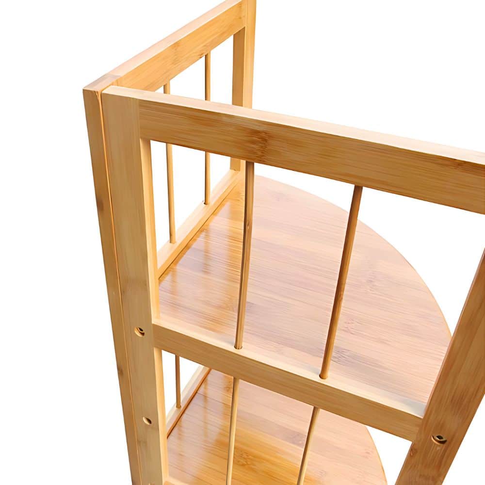 El diseño esquinero optimiza el uso del espacio en aquellas áreas a menudo desaprovechadas, permitiendo una mayor organización sin ocupar demasiado lugar. Su estructura robusta y su color natural de bambú hacen que este mueble sea una adición versátil y decorativa en cualquier estancia, como baños, cocinas, salones o dormitorios.
