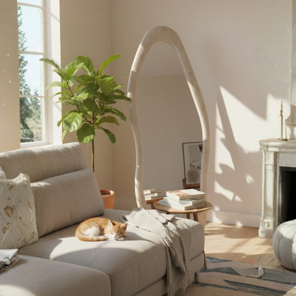 Espejo Irregular Con Ondas De Pie Terciopelado Mdf Moderno Decorativo 160x60cm color BEIGE
