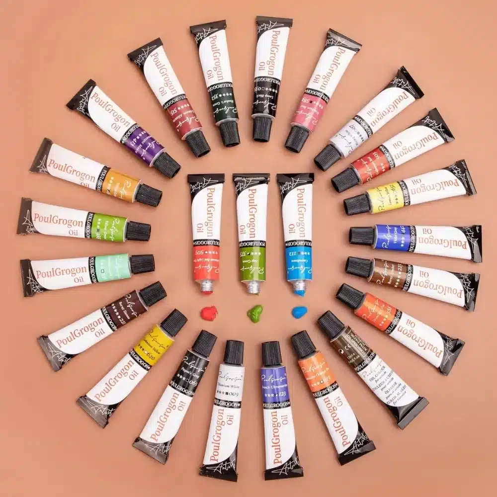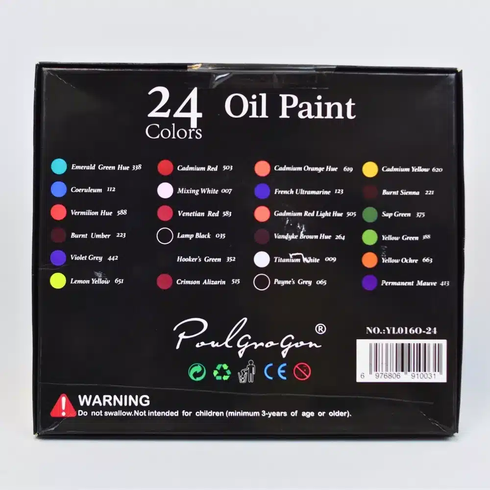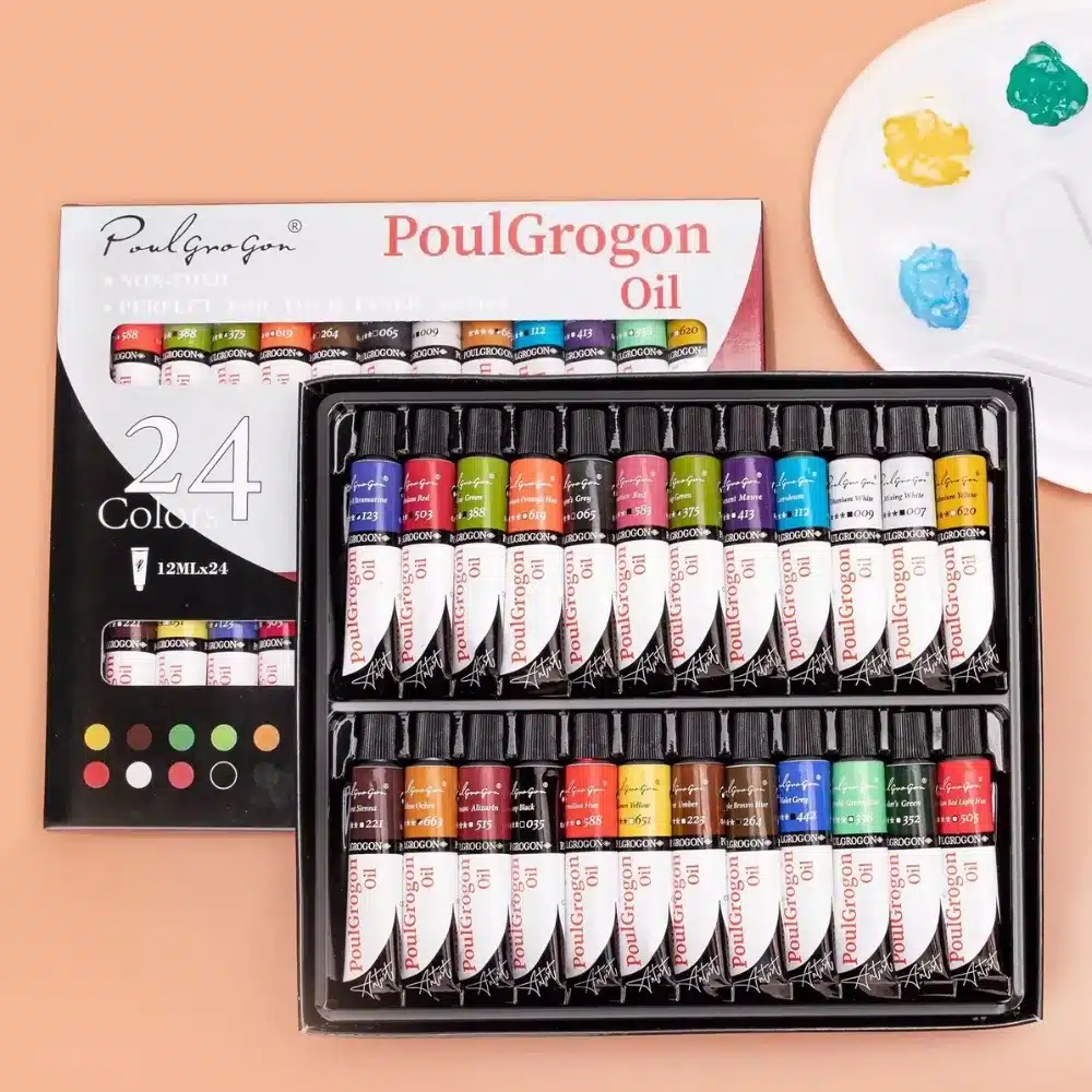 Set de 24 pinturas al óleo de 12 ml cada una, con una amplia gama de colores vibrantes. Ideal para artistas de todos los niveles, perfecto para crear obras de alta calidad.