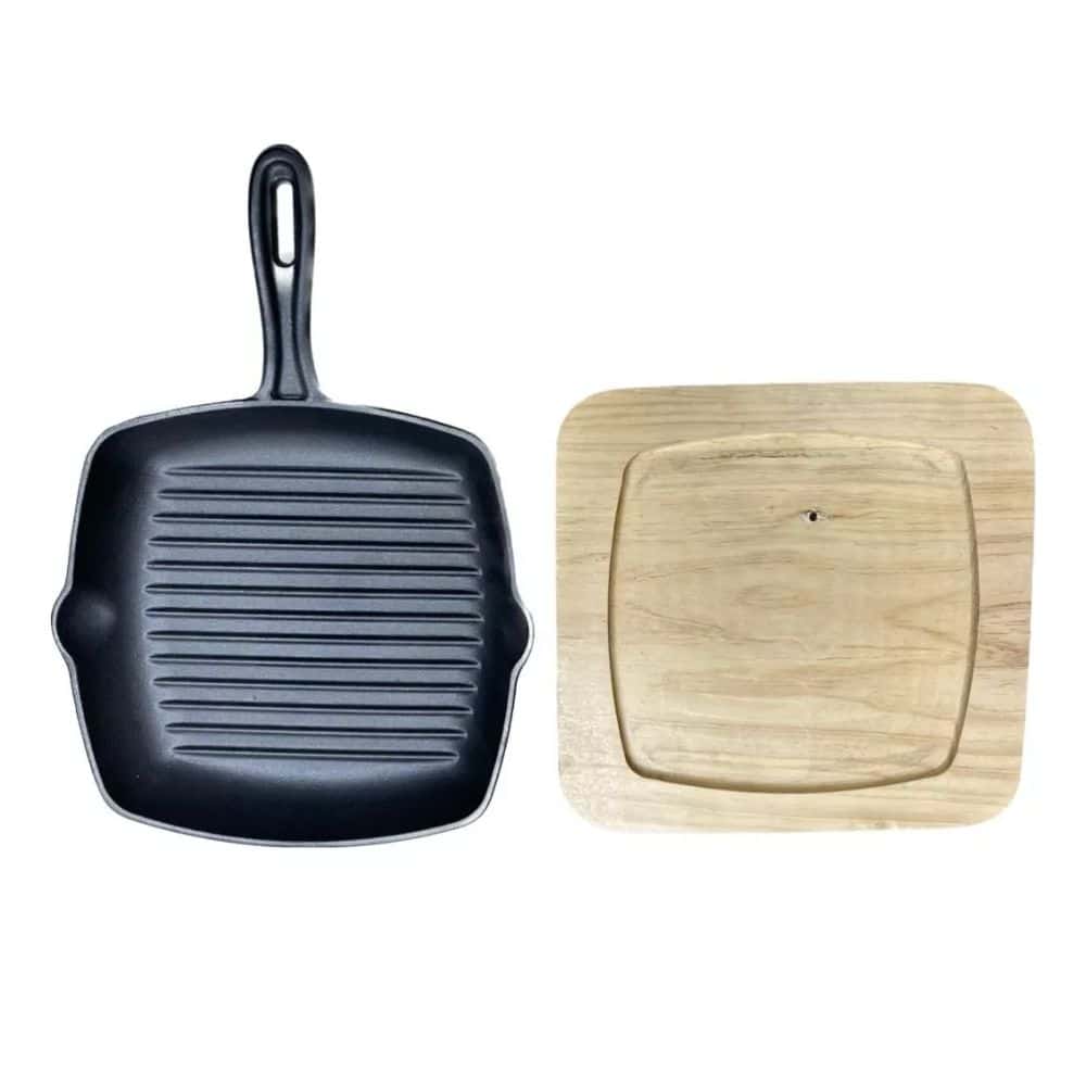 La Plancha De Hierro Fundido Cuadrada 22cm Con Tabla De Madera es perfecta para cocinar y servir con estilo.