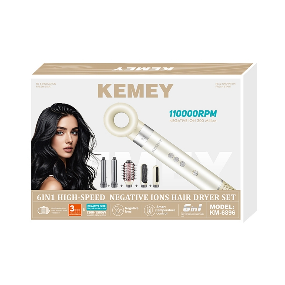 El secador de pelo profesional 6 en 1 Kemey KM-6896 combina innovación, potencia y versatilidad en un solo equipo. Diseñado con tecnología avanzada de iones negativos y un motor brushless de alta velocidad 110000 RPM, ofrece un secado rápido, silencioso y con acabado de salón, ideal para usar en el hogar de forma sencilla y segura.