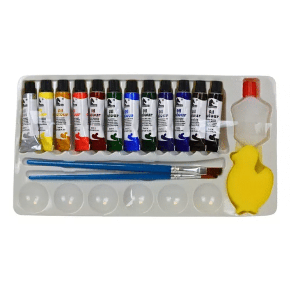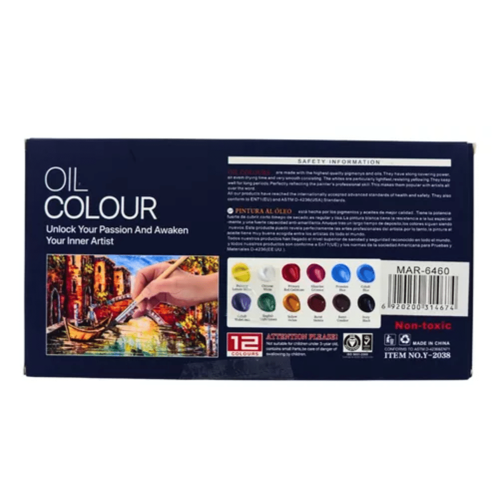 Set de 12 pinturas al óleo de colores vibrantes (6 ml cada tubo), ideal para artistas principiantes y avanzados. Incluye pinceles para una aplicación precisa y versátil. Perfecto para crear obras llenas de color y profundidad.