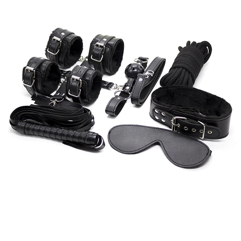 Set Bdsm 7 Piezas Esposas Latigo Bondage Cuerda Cuero Mli NEGRO