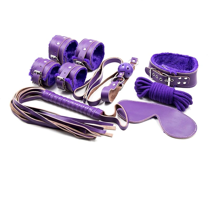 Set Bdsm 7 Piezas Esposas Latigo Bondage Cuerda Cuero Mli VIOLETA