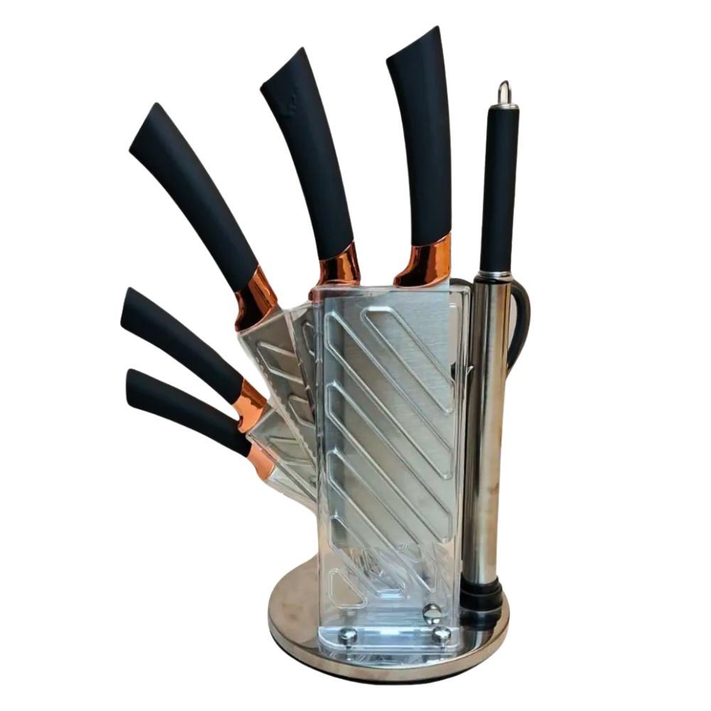 Set de Cuchillos 7 Piezas Acero Inoxidable Con soporte Tijera y Afilador Base Rotativa 360 Mango Ergonomico