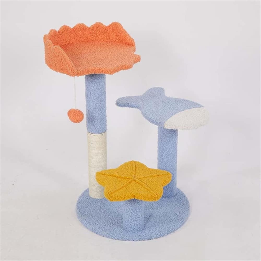 Esta torre para gatos de 63x40x40 cm es la solución perfecta para espacios pequeños sin sacrificar la diversión y comodidad de tu gato. Con tres niveles únicos que incluyen una flor, un pez y una tarima superior, tu gato podrá trepar y descansar en cada plataforma. La estructura está hecha de madera resistente, con rascadores de sisal natural para el cuidado de sus uñas, y cubiertas de felpa suave, ideal para relajarse.