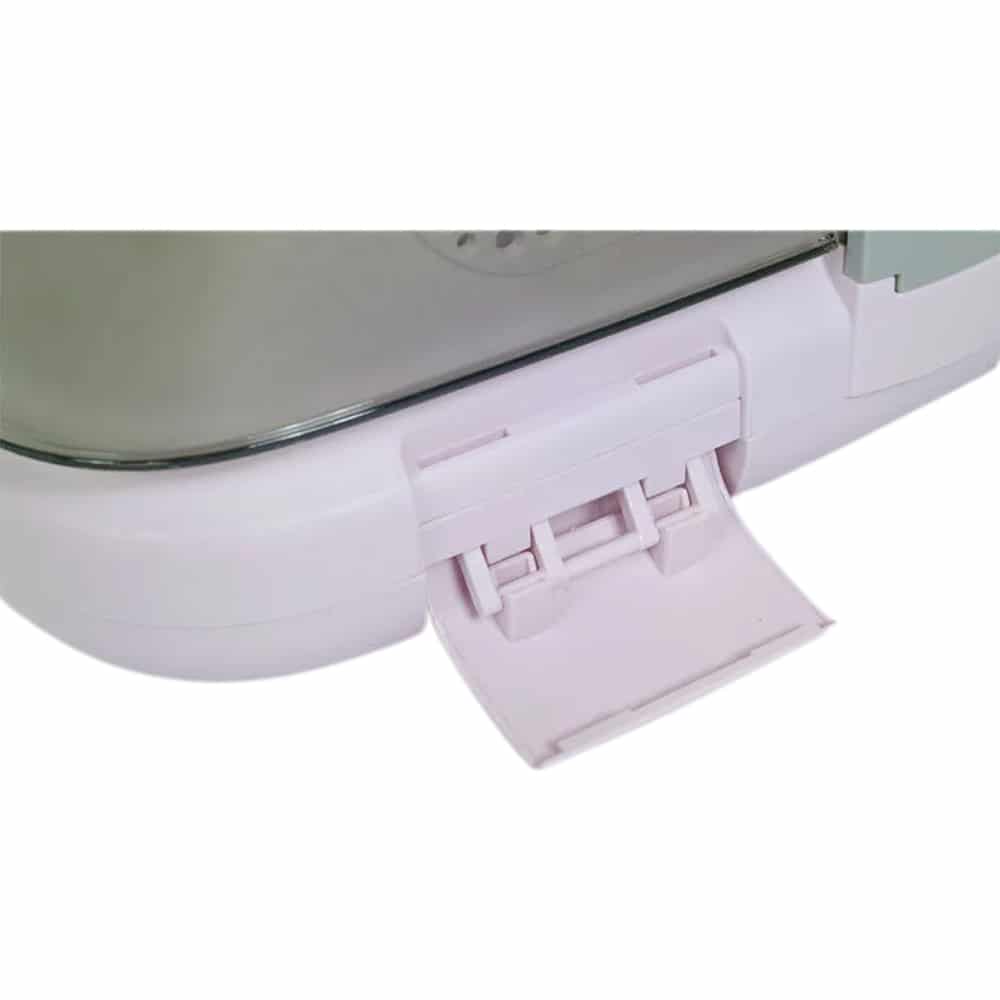 La transportadora cuenta con una puerta corrediza hacia arriba que se asegura con una tranca, brindando seguridad adicional. Asimismo, posee respiraderos en ambos laterales para asegurar una adecuada ventilación en todo momento. Para mantener la higiene, incluye una bandeja inferior extraíble que facilita la limpieza.